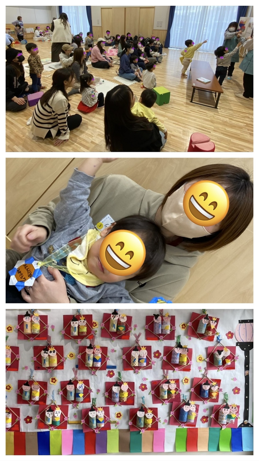 2月のるんるんは、「おひな様をつくろう ヤクルトの容器に千代紙の着物を着せて、思い思いにお顔を描いて、お内裏さまに烏帽子としゃく、お雛さまに冠と扇を付けて、二人並べて台紙に貼ったらいろんな表情のおひな様ができました🎎 作ったおひな様は可愛く飾り付けをして、2月28日・3月1日の公民館まつりで展示します ご家族で見に来てくださいね〜 その後は、保育所の先生が手遊び歌や絵本を楽しく読んでくれました 「きんぎょが逃げた」の大型絵本では、絵本の前に出てきて、ここにいたいた 2月のお誕生会は一人だけでしたが、メダルをもらいみんなでハッピーバースデー 来月は、自由遊び&卒業るんるんです。 |