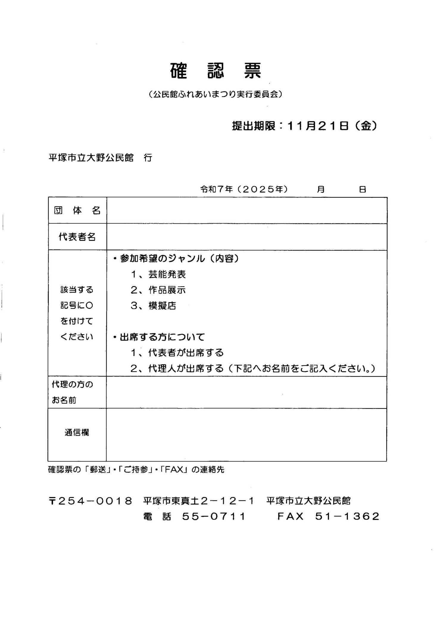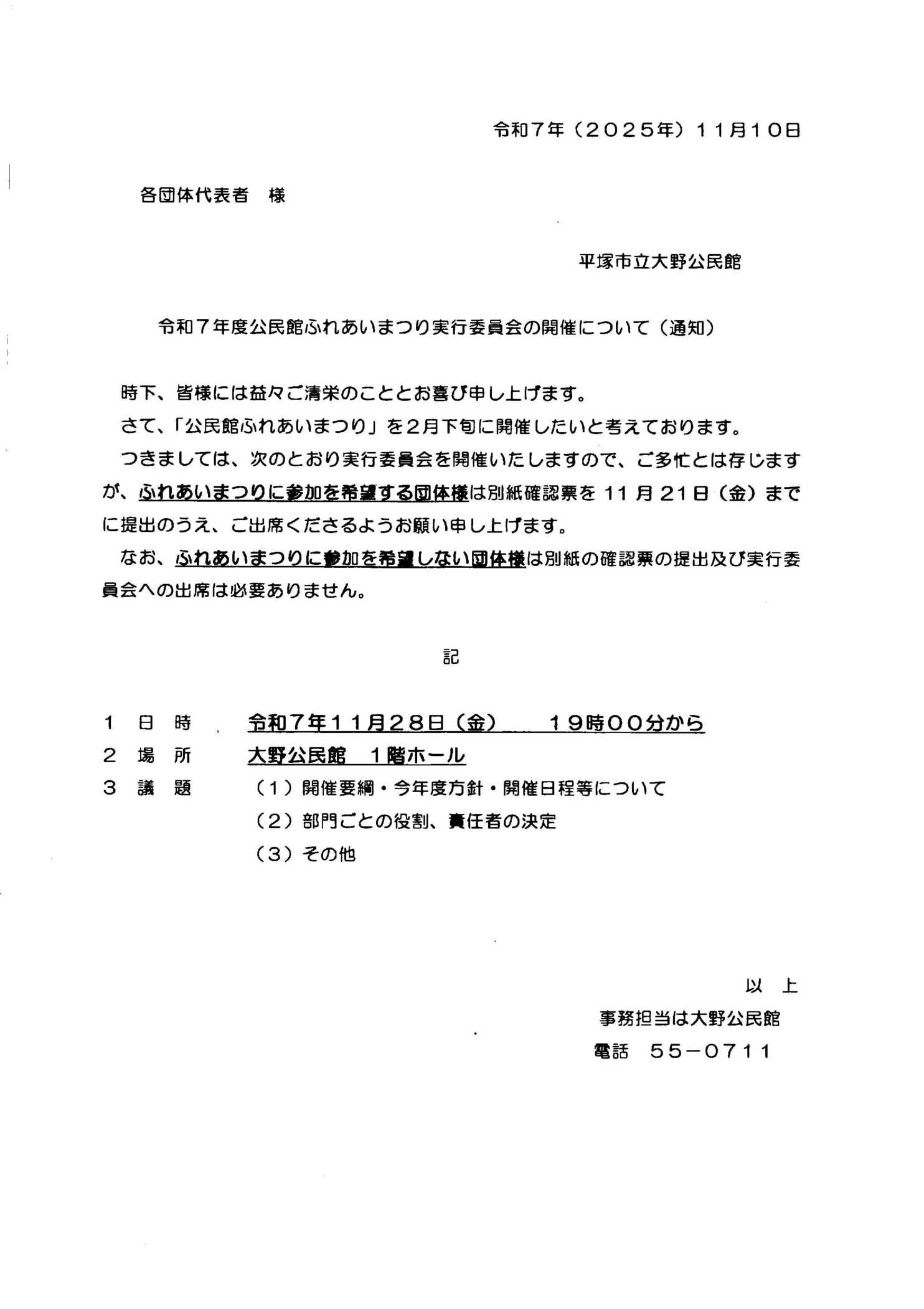 - 2025/11/26 大野公民館ふれあいまつり実行委員会(令和7年度)の案内 11月28日 (金) 19時00分〜 大野公民館1階ホール