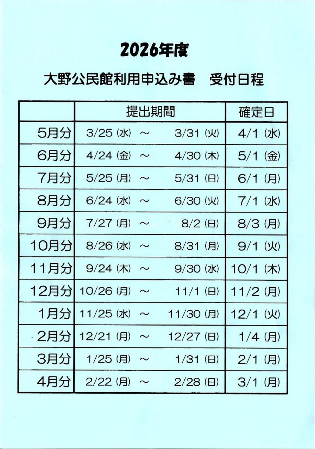 - 2026/01/28 大野公民館利用申込み書 受付日程 2026年度(令和8年度)