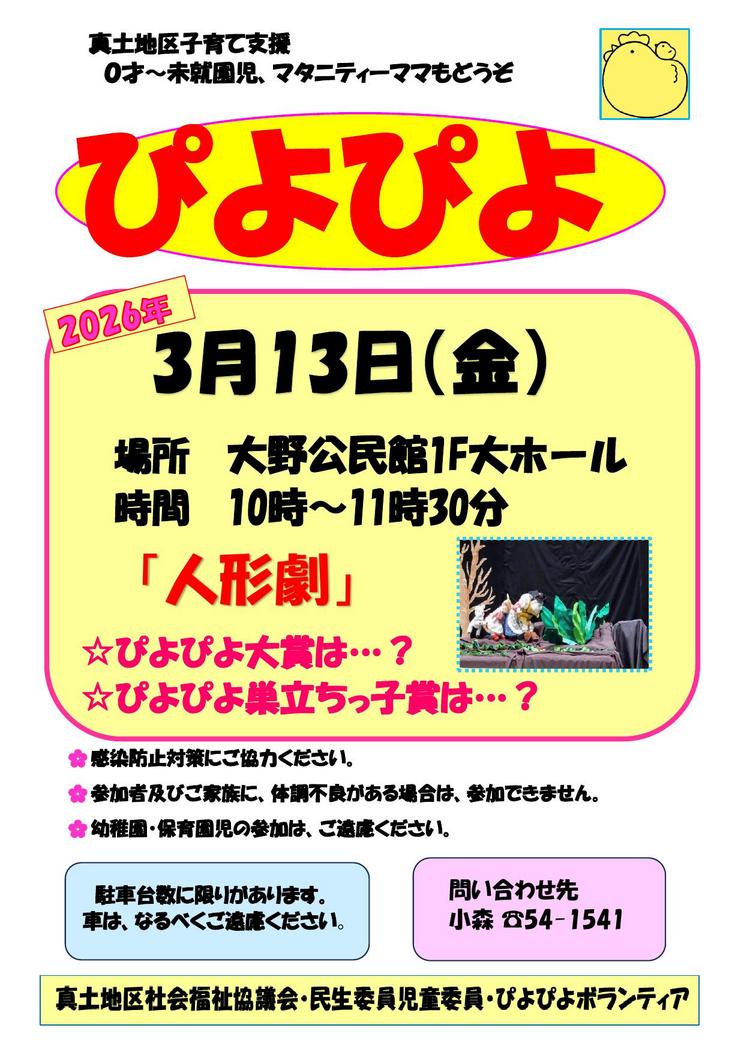 - 2026/03/01 「ぴよぴよ」3月開催のご案内 2026年3月13日(金) 10:00〜11:30 大野公民館1階ホール