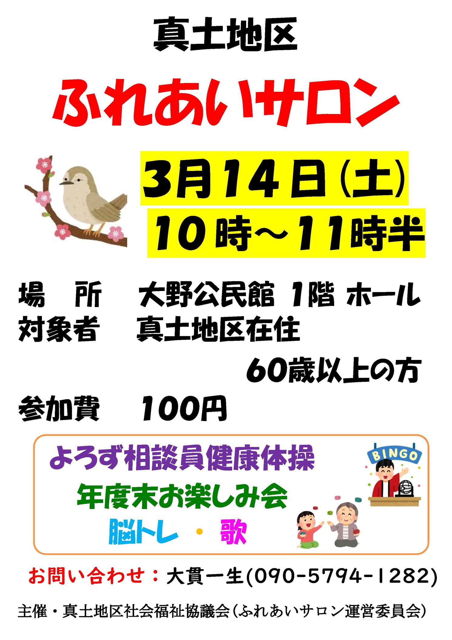 - 2026/03/01 真土ふれあいサロン 2026年3月開催のご案内 3月14日(土) 10時00分 〜 11時30分 大野公民館 1階 ホール