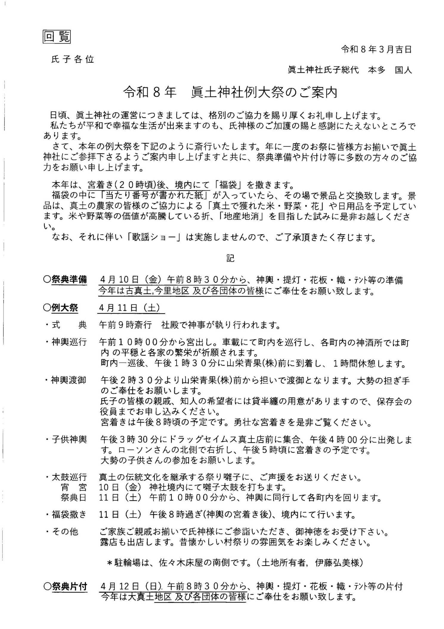 - 2026/03/21 令和8年眞土神社例大祭のご案内 4月11日(土) 式典:午前9時斎行 神輿巡行:午前10時00分から宮出 神輿渡御:午後2時30分より 子供神輿:午後3時30分【回覧】