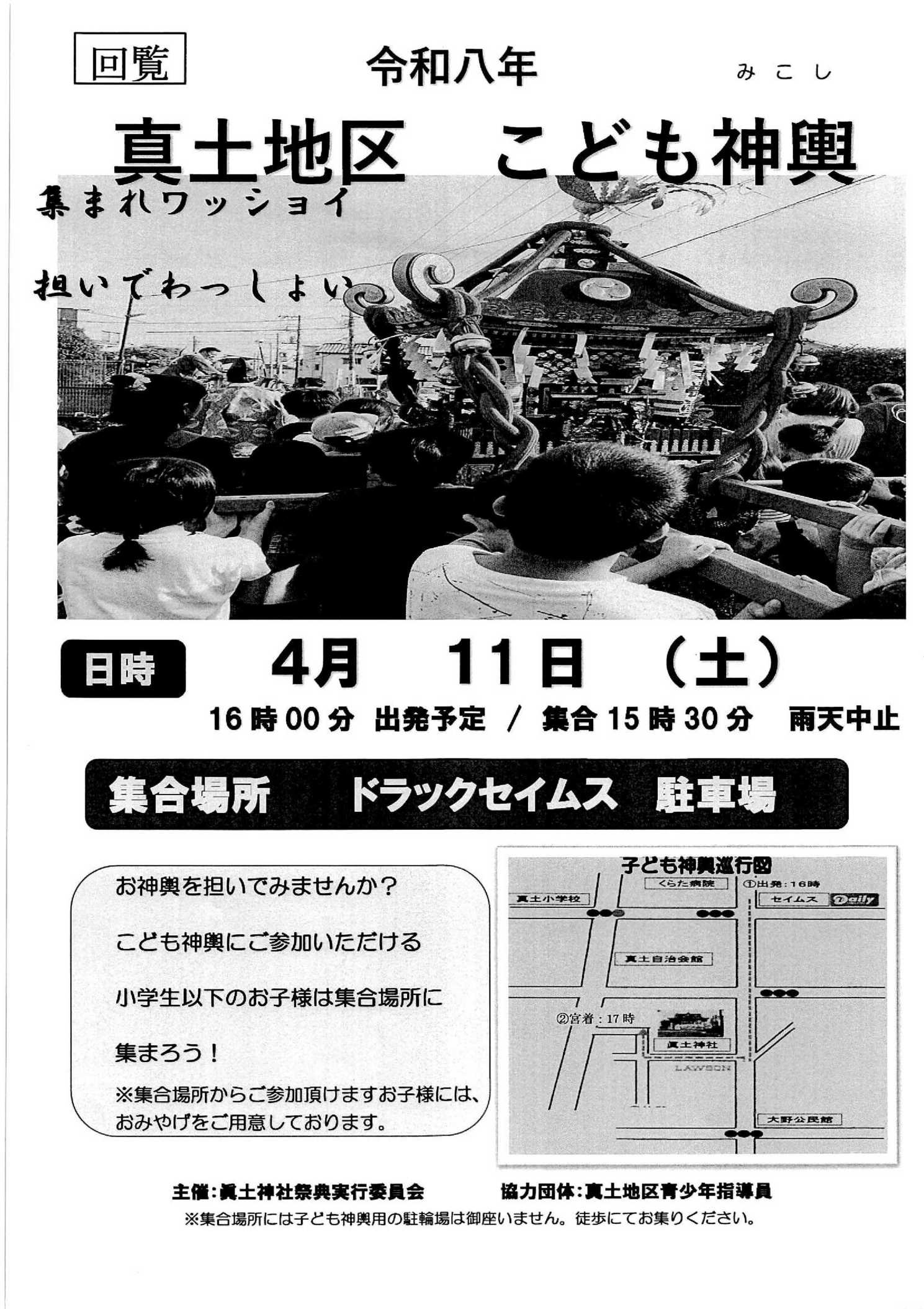 - 2026/03/21 こども神輿のご案内 集まれワッショイ 眞土神社例大祭4月11日(土) 集合15:30 ドラックセイムス様駐車場 16:00出発予定 雨天中止 【回覧】