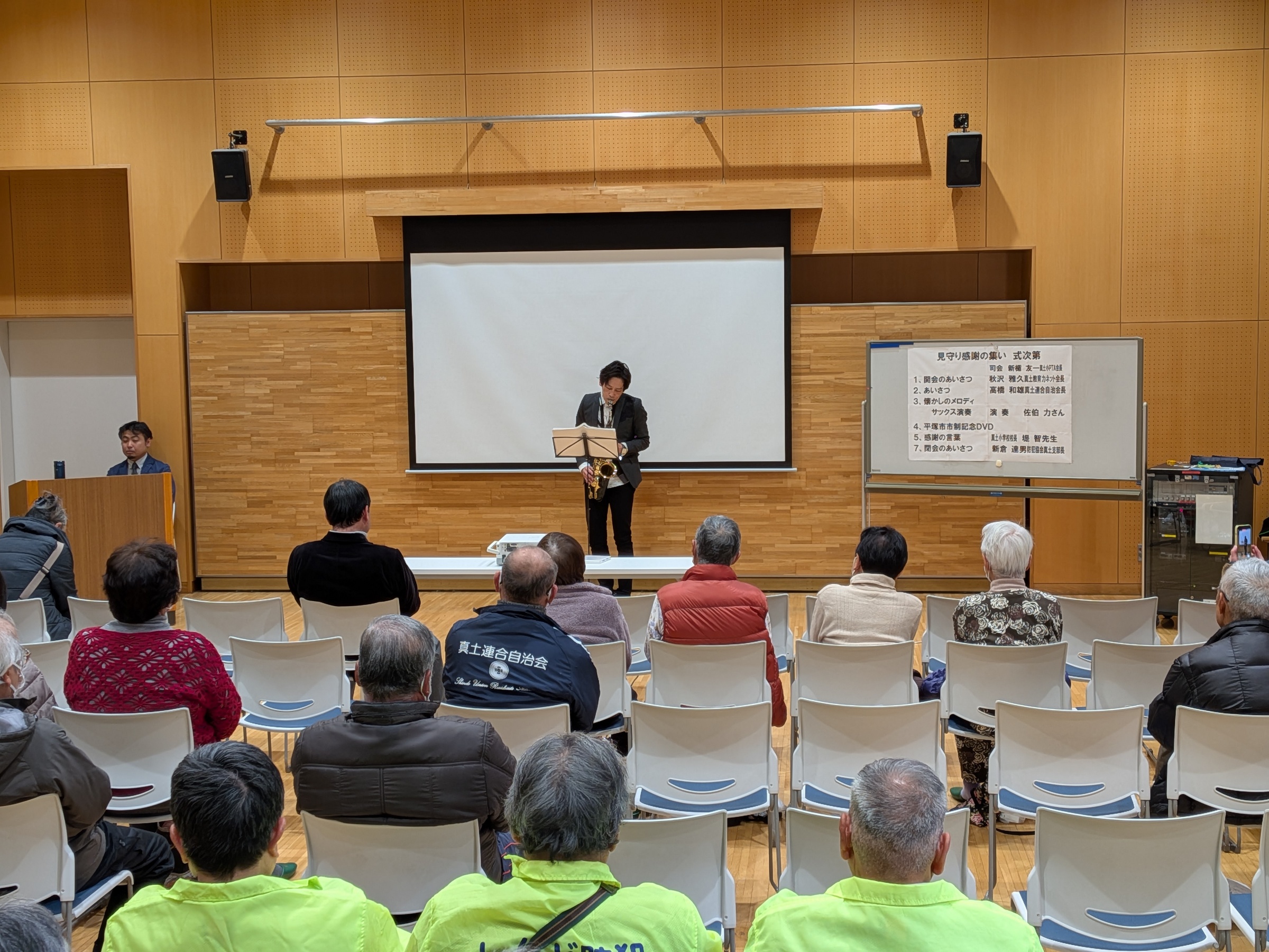 ■子ども見守りパトロール感謝の集い■ ![]() 今回は「懐かしのメロディ」と題してして、佐伯 力さんにサックス演奏をしていただきました。 |
