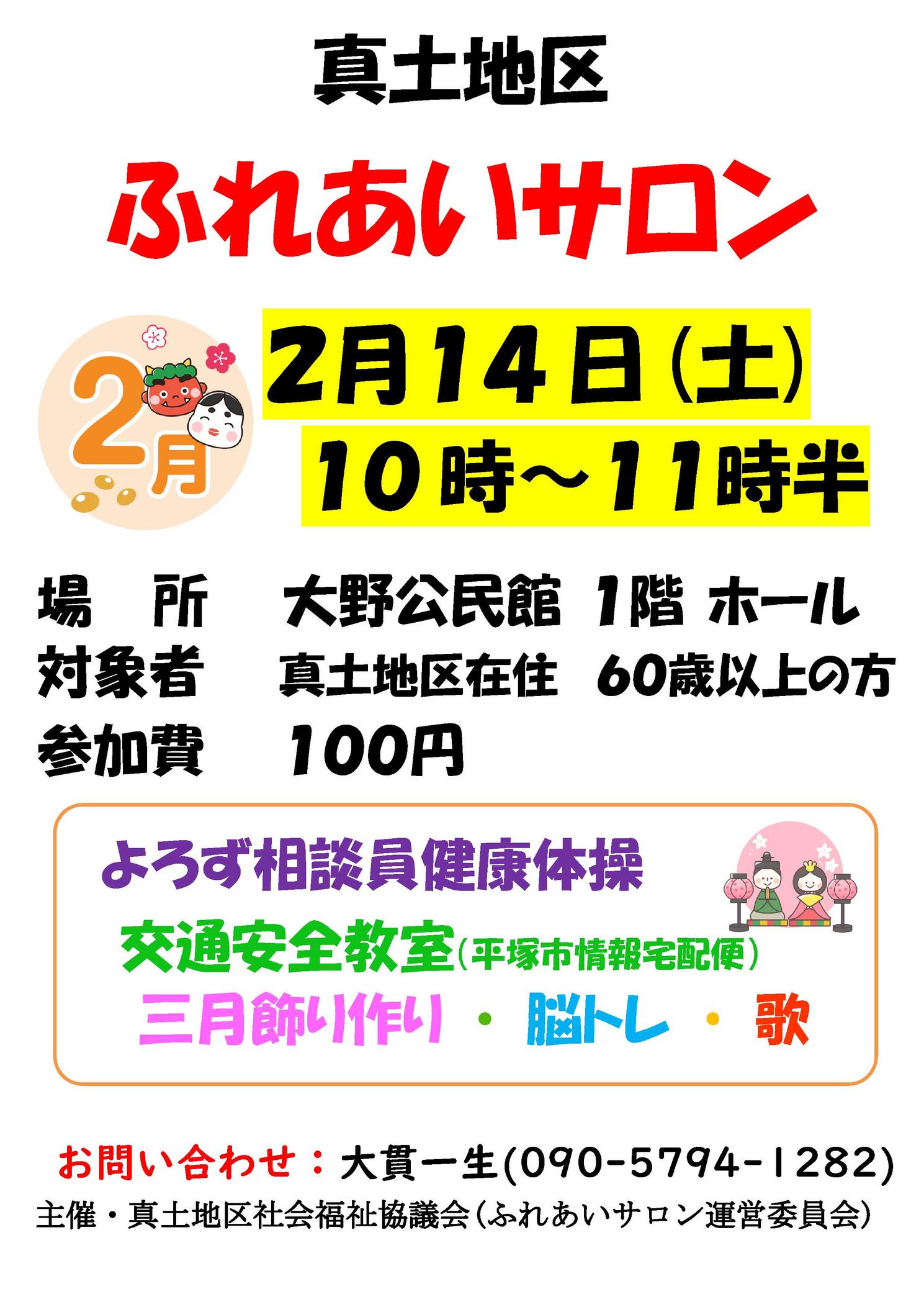 - 2026/01/23 真土ふれあいサロン 2026年2月開催のご案内 2月14日(土) 10時00分 〜 11時30分 大野公民館 1階 ホール