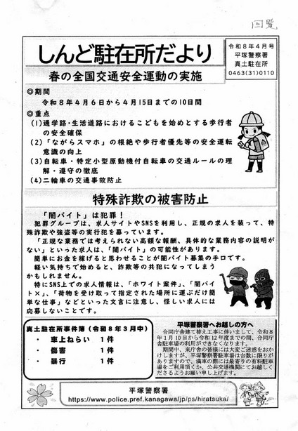 ■ しんど駐在所だより 令和8年4月号 ■ ┃ 春の全国交通安全運動の実施 ┃ 特殊詐欺の被害防止 ┃ 真土駐在所事件簿(令和8年3月中) ┃ 平塚警察署へお越しの方へ (投稿掲載 情報局:MT) 印刷や拡大表示に利用できます ↓ ↓ ↓ |