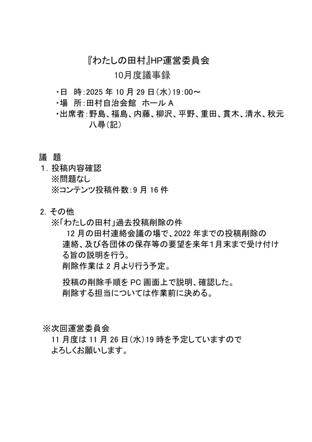 - 2025/11/03 わたしの田村10月度HP運営委員会開催(次回は11月26日です)