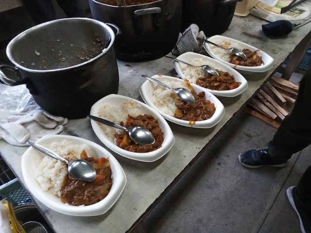美味しいカレーにしようと、たがいに声を掛け合いながら作業している様子が見られました。 子どもたちは、出来上がりに大満足! 「いただきます!」の声が金太郎広場に響きました。 |