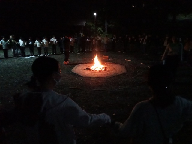 キャンプファイヤーは、つなぐの火、なりたい自分の火、きりかえの火、自分らしさの火の4つの火が誓いの言葉とともに点火されて始まりました。 グループごとのスタンツや中山先生とエンジョイ係のレクとダンスで盛り上がりました! 最後は火も小さくなり、『今日の日はさようなら』を歌いながらそれぞれのコテージに戻る子どもたちでした。 | |