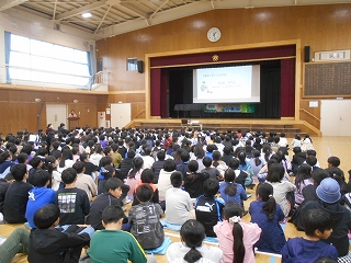 今回のテーマは「けがの予防とけがのてあて」 目的は次の2点です。 ・安全なすごし方を考えよう。 ・けがのてあてをおぼえておこう。 前半は、保健室の野川先生のお話、後半は保健委員会の子どもたちによる劇『けがのてあて 〜鼻血・すりきず〜』でした。 お話は、八幡小学校で起きるけがの特徴についてのクイズに答えたり、イラストを見て起こりそうなけがについて予測したり、子どもたちは頭を働かせていました。 劇は、けがのてあてについて、日常場面の再現と説明で、子どもたちにとって共感できる内容でした。 全校児童にわかりやすいように工夫されたお話と劇で、学校での安全について考えるよい機会となりました。 最後に、お話に出てきたクイズから1問。 【問題】八幡小学校で、けががいちばん多かった場所はどこでしょう? @体育館 A運動場 B教室 ※答えは次回 | |