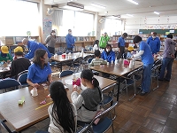 給食センターで、持ち運びやすいメニューを用意してくださったので、教室以外のところで給食を食べました。 メニューは、ソースチキンカツサンド (まるパンスライス、チキンカツ、ゆでキャベツ)、やさいジュース、スイートポテト、バナナです 11月13日(木)B献立 子どもたちは、屋上やはだしの庭、体育館で食べました。 4・5・6年生は、クラブ活動のメンバーで一緒に。 屋上からは、雪化粧をした富士山を見ることができました。 | ||