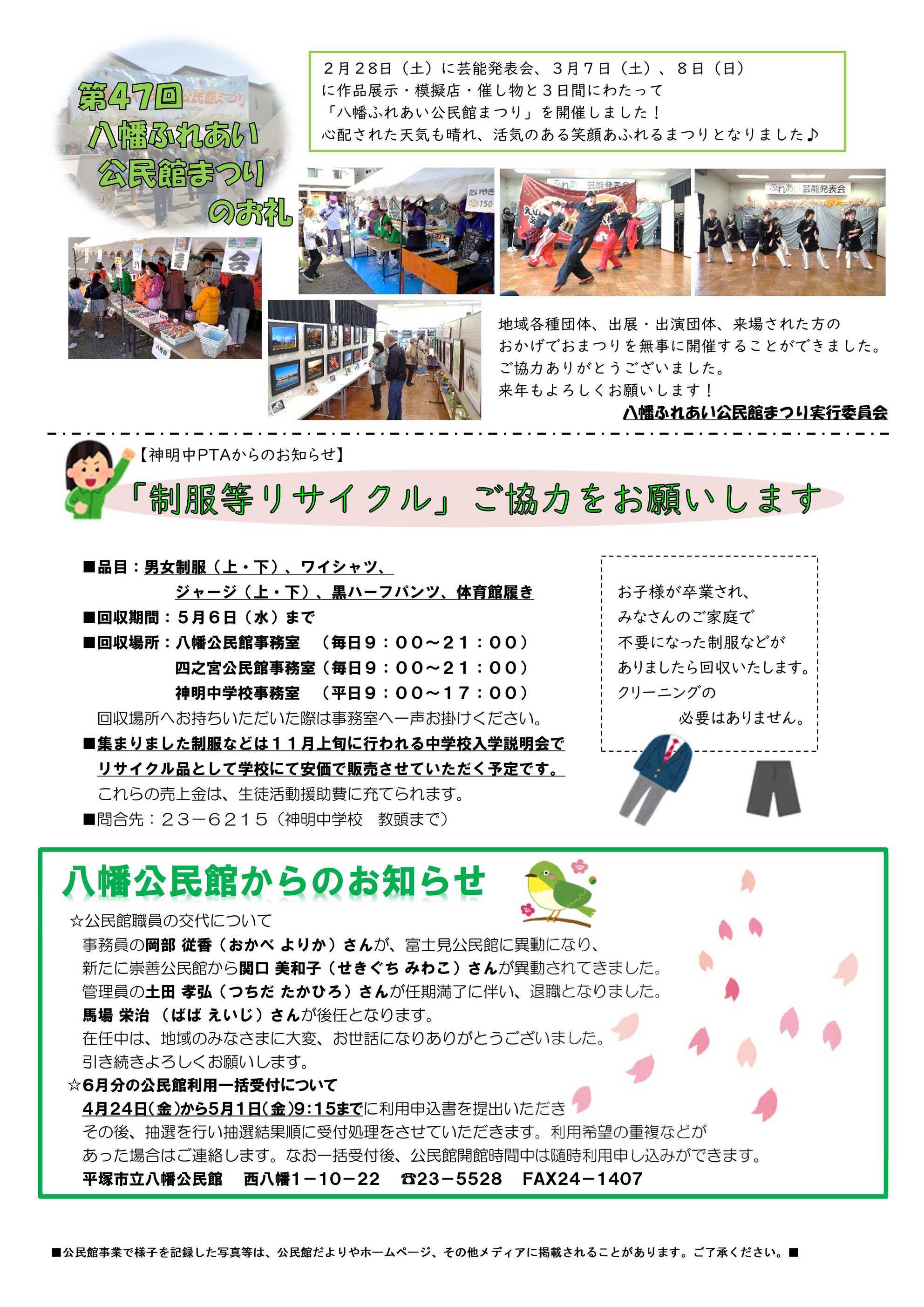 体育館で修了式と離退任式を行いました。 修了式では、校長先生からのお話と児童指導の先生から春休みの過ごし方についての話がありました。 つづいて、離退任式。最初に、5年生の児童代表が一人一人への言葉が入った挨拶をしました。次に、離退任する7名の先生方からは子どもたちへメッセージを送りました。最後に、離任する先生方を送る気持ちで全員で「校歌」を歌いました。 今年度の「”やわた”ちいき情報局」の更新はこれで終わりです。1年間ご覧いただきありがとうございました。来年度も八幡小学校をよろしくお願いいたします。 | ||