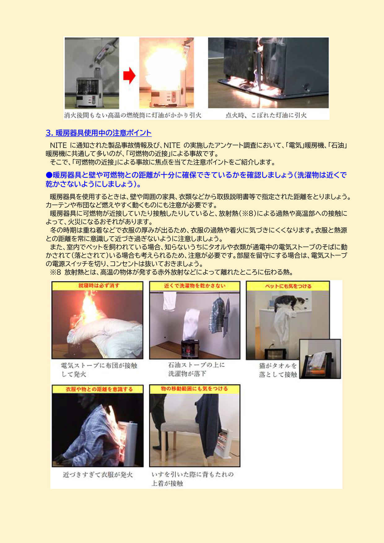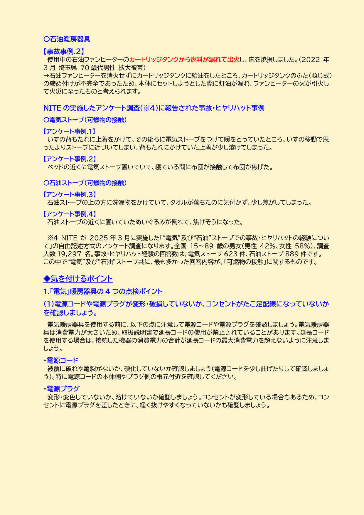 ■NITE では、10月30日に注意喚起として『ストーブとの程よい距離感が大切です 〜「電気」「石油」暖房器具の事故を防ぐ4+1のポイント〜』をプレスリリースしています。事故の詳細な分析結果や、今回のアンケート事例としてご紹介した調査の結果詳細も掲載していますので併せてぜひご覧ください。 https://www.nite.go.jp/jiko/chuikanki/press/2025fy/prs251030.html 新作動画 電気ストーブ「9.可燃物接触(事故につながるNG4選)」 https://www.nite.go.jp/jiko/chuikanki/poster/kaden/20251030.html |