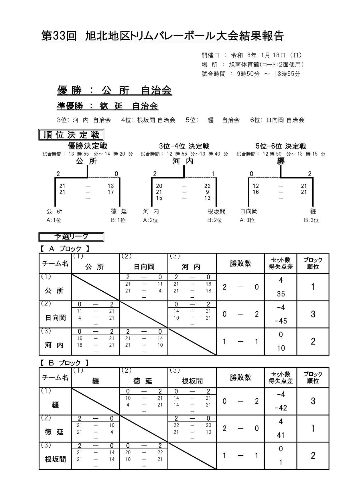 - 2026/01/26 R7年度 第33回トリムバレーボール大会 結果:公所チームが優勝!