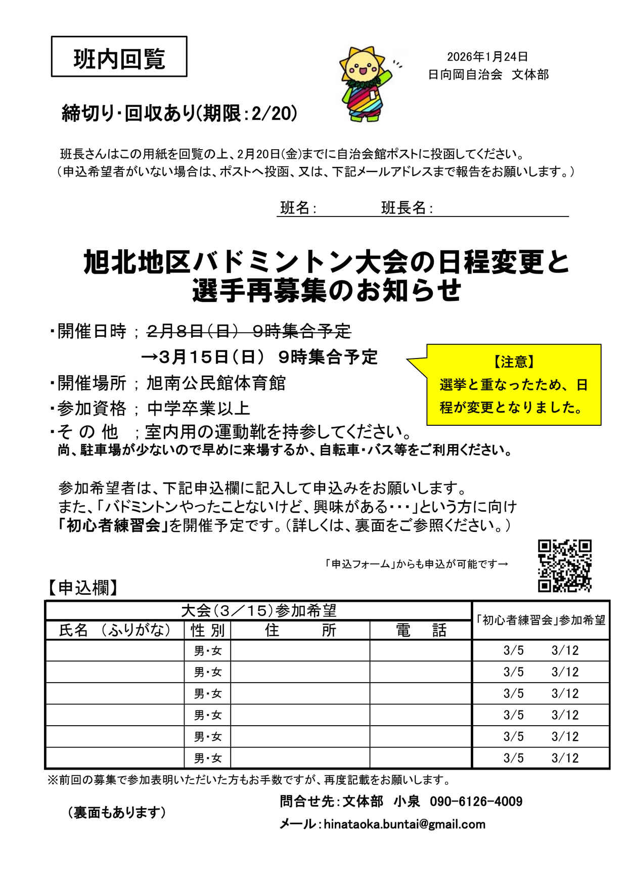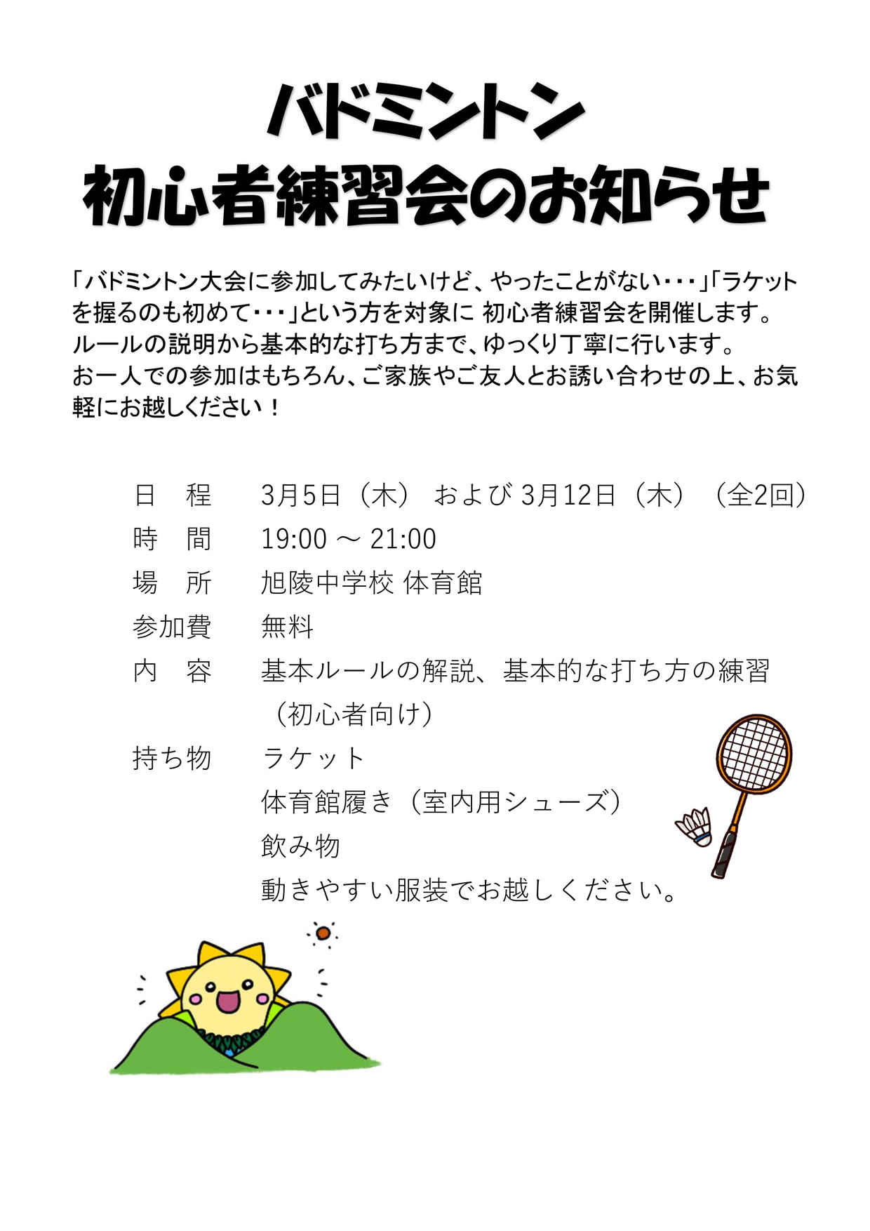 - 2026/01/27 旭北地区バドミントン大会の日程変更と選手再募集のお知らせ