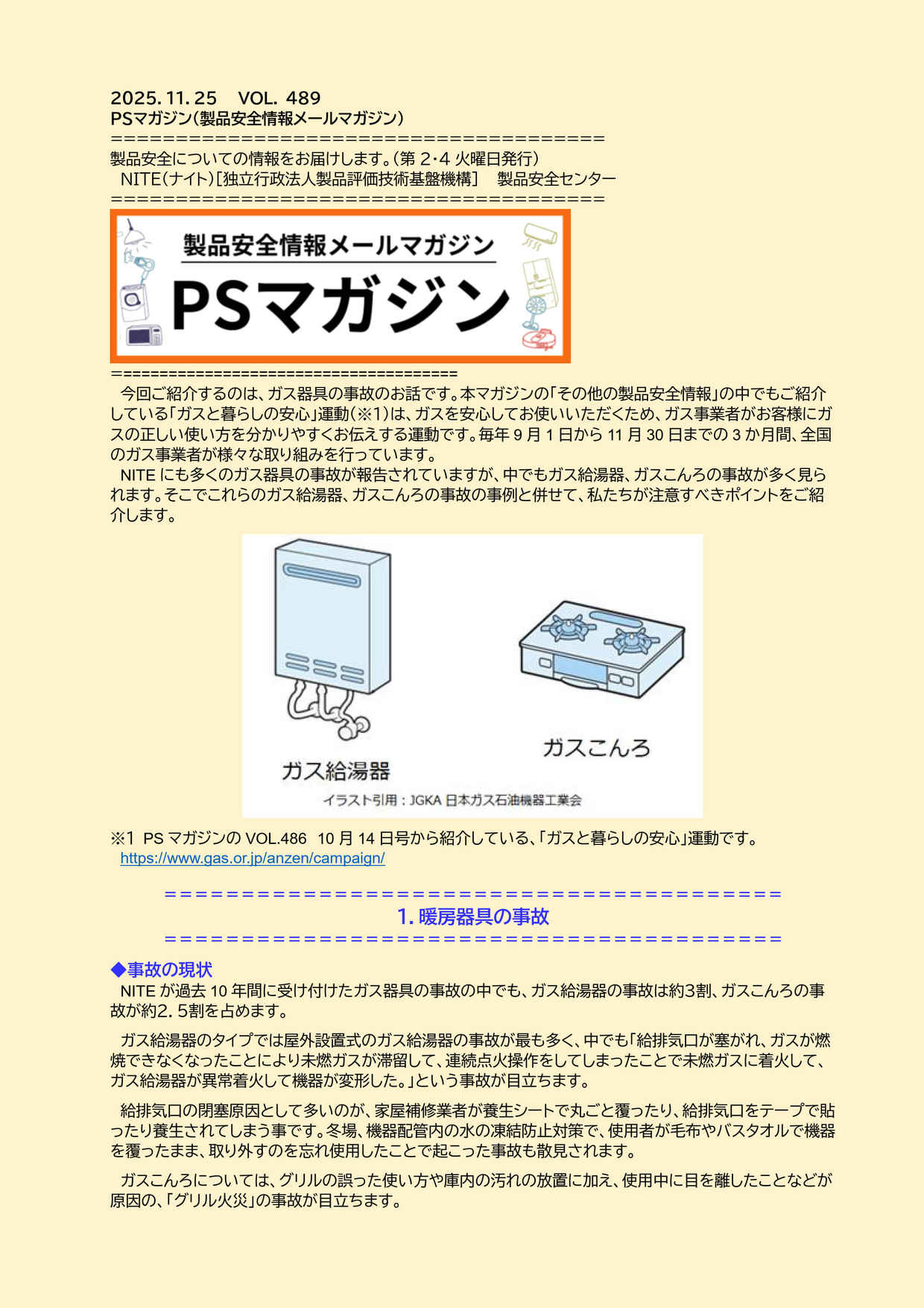 【PSマガジンvol.489】11月25日号「ガス給湯器、ガスこんろの事故」