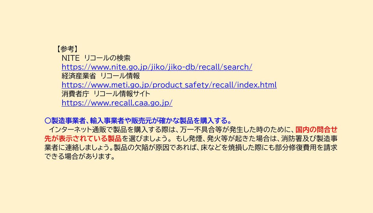 【参考】 (クリックするとサイトに飛びます) NITE リコールの検索 経済産業省 リコール情報 消費者庁 リコール情報サイト ■その他の情報も併せてご参照ください。 (映像資料:リンク先で動画が視聴できますので是非ご覧下さい) (1) 充電器「3.充電ケーブルに液体がこぼれて異常発熱」 (2) モバイルバッテリー「1.リコール製品のモバイルバッテリーから発火」 (3) モバイルバッテリー「5.異常発生時の対処」 (4) モバイルバッテリー「6.高温下に放置して発火」 (注意喚起ミニポスター) (1) リチウムイオンバッテリー搭載製品の事故 (2) 充電ケーブルがショートする事故 |