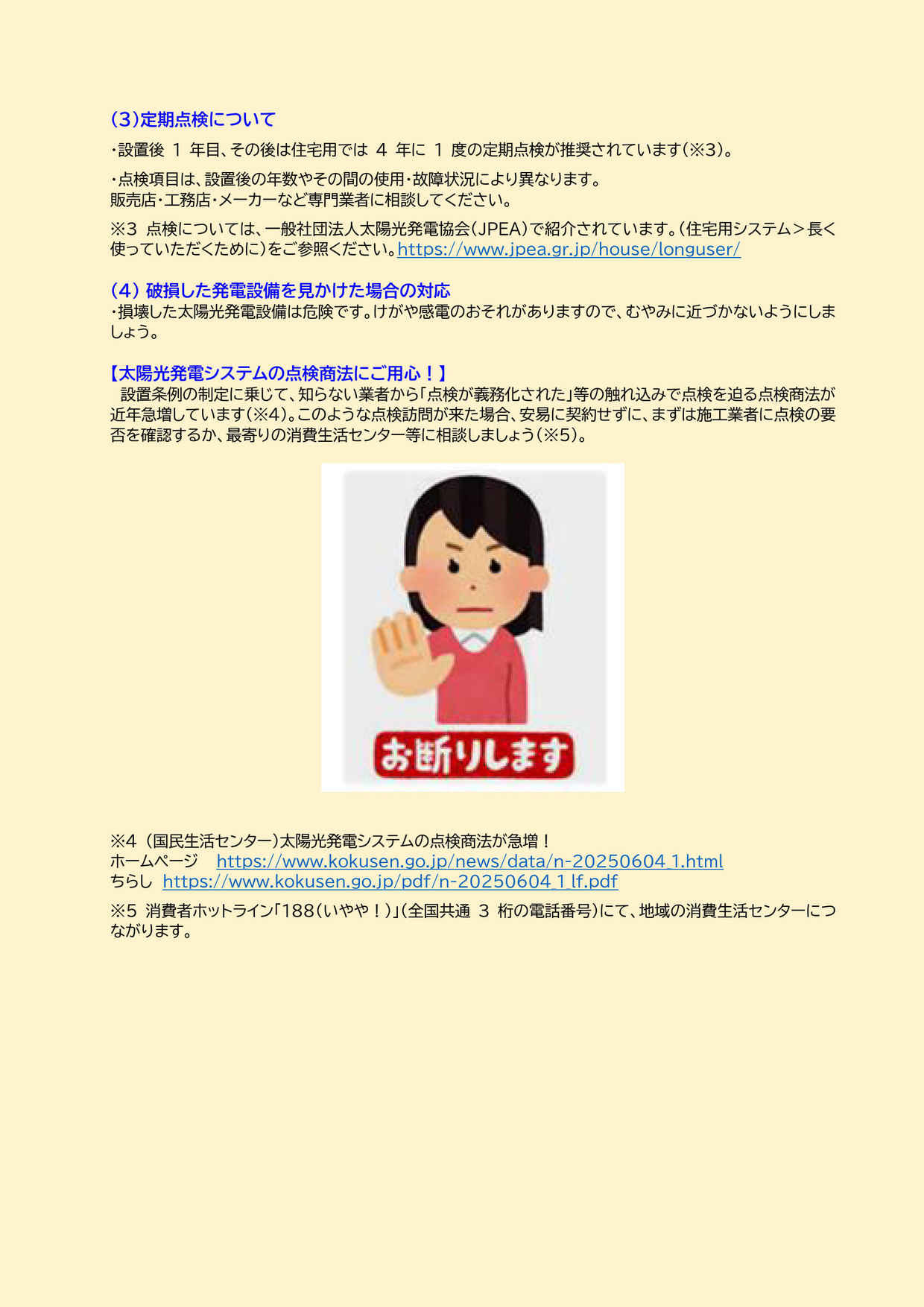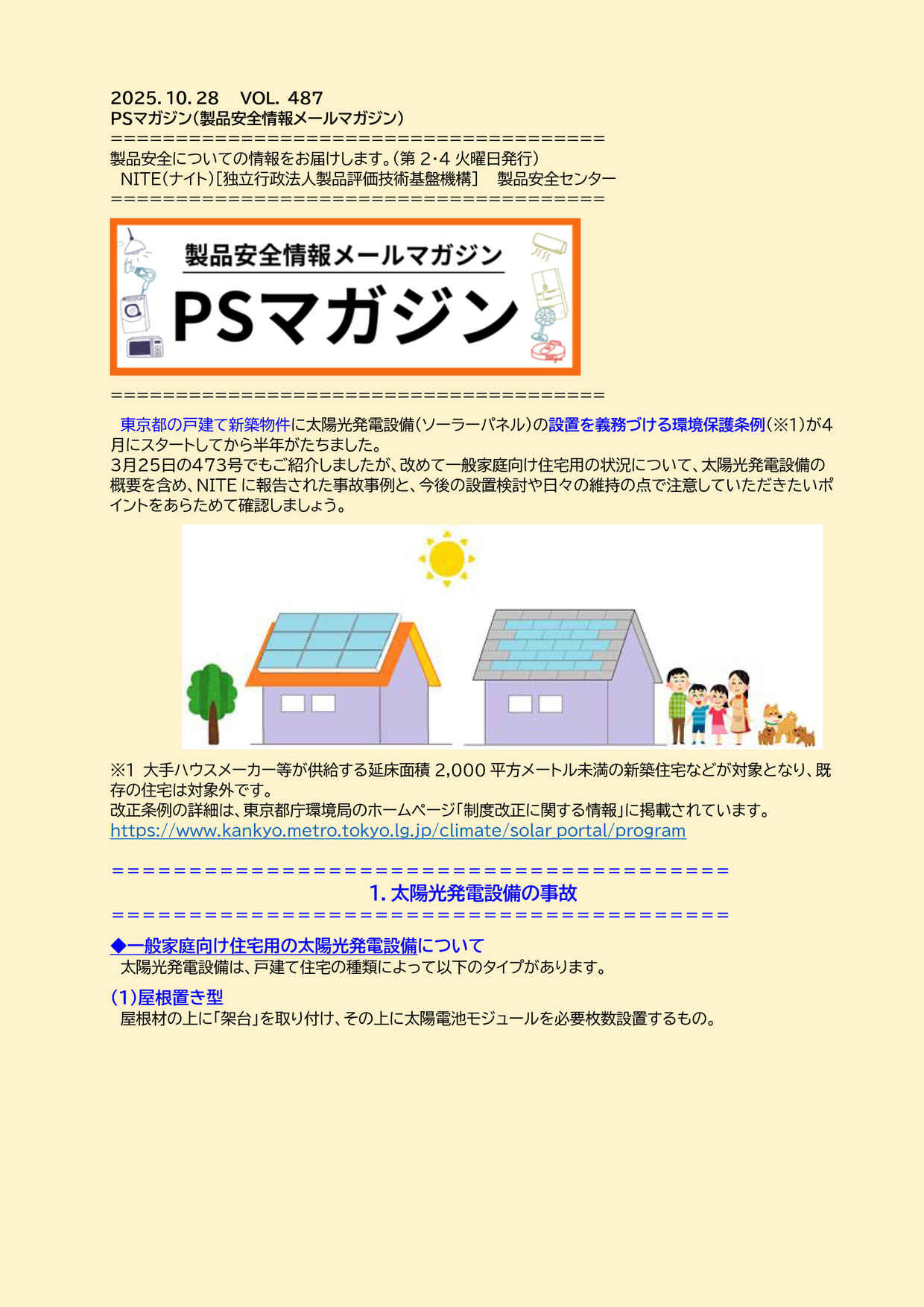 ※1 大手ハウスメーカー等が供給する延床面積2,000平方メートル未満の新築住宅などが対象となり、既存の住宅は対象外です。 改正条例の詳細は、東京都庁環境局のホームページ「制度改正に関する情報」に掲載されています。https://www.kankyo.metro.tokyo.lg.jp/climate/solar_portal/program (参考事項) 一般家庭向け住宅用太陽光発電設備の法的な位置づけ ご紹介した一般家庭向け住宅用に使用されているタイプは、出力10kW未満の太陽電池発電設備に分類され、電気事業法上では「一般用電気工作物」になります(※6)。このタイプは、電気主任技術者の選任や保安規程の届出は不要ですが、技術基準適合義務が課せられており、適合していないと認めるときは、その所有者等に対し、技術基準適合命令を行う場合があります(電気事業法第56条)。 また、電気事業法に基づく立入検査を受けることもあります。この事からもユーザー・所有者は、普段から適切な管理を心がけないといけません。 ※6 経済産業省HP 「一需要場所・複数引込」及び「複数需要場所・一引込」の電気事業法上の取扱い(電気保安)より。出力 10kW 未満の太陽電池発電設備であっても、自家用電気工作物と当該 10KW 未満の太陽電池発電設備の間に電気的な接続がある場合、「自家用電気工作物」の扱いになる場合もあります。 https://www.meti.go.jp/policy/safety_security/industrial_safety/law/files/juyoubasyohikikomi.pdf ■NITE では、8月29日に注意喚起として『住宅用の太陽電池発電設備の事故に注意〜事故を発生させないための対策、事故発生後の対応、ともに大事です〜』をプレスリリースしています。併せてぜひご覧ください。 https://www.nite.go.jp/jiko/chuikanki/press/2025fy/prs250829.html ・PSマガジン バックナンバー Vol.473 3月25日号「太陽光発電設備の事故」 https://www.nite.go.jp/jiko/chuikanki/mailmagazin/2024fy/vol473_250325.html |