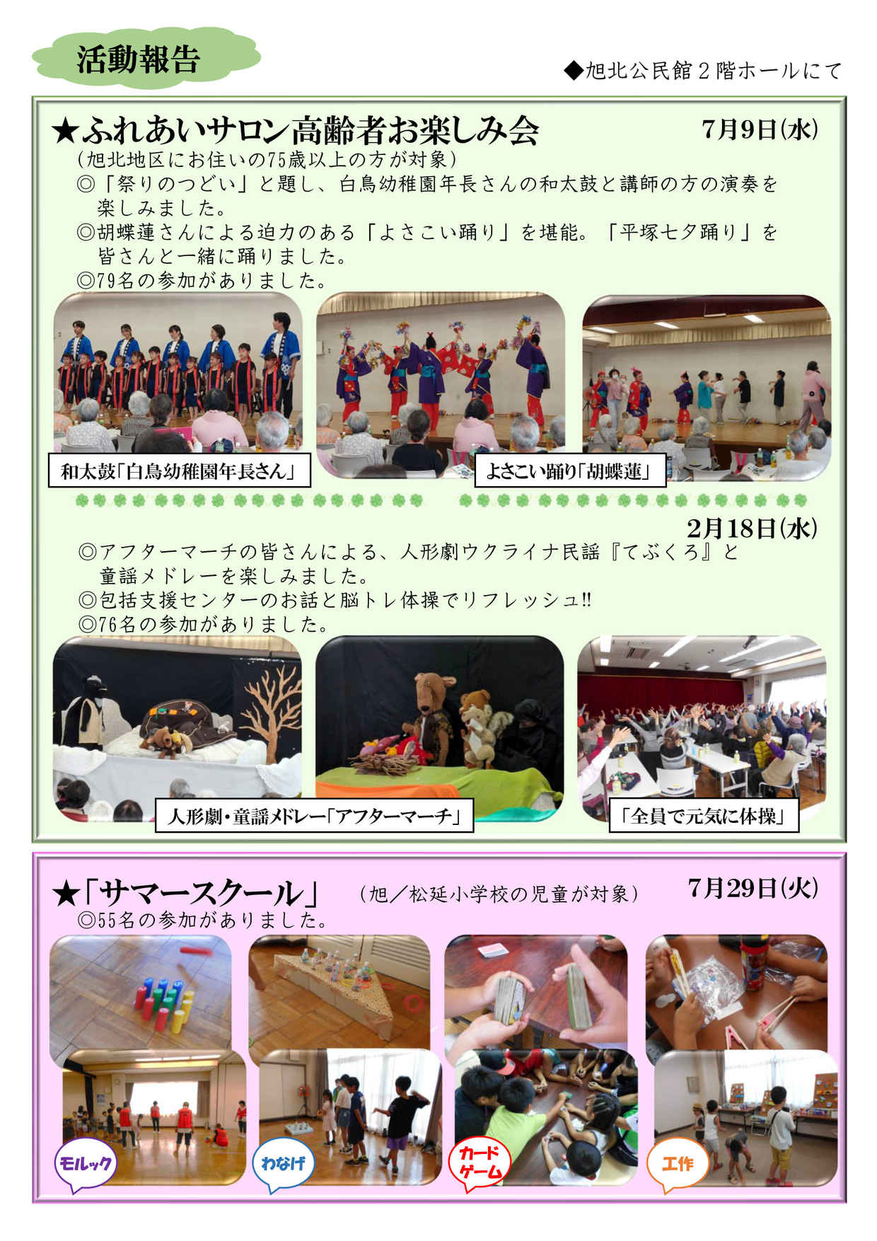 学校も1小学校・1中学校から、小学校4校、中学校3校に増加し、公民館も南北二つに分かれ、昭和58年、旭北公民館が新設・発足し、平成元年には自治会連合会も二つに分かれて活動を開始し現在に至っています。