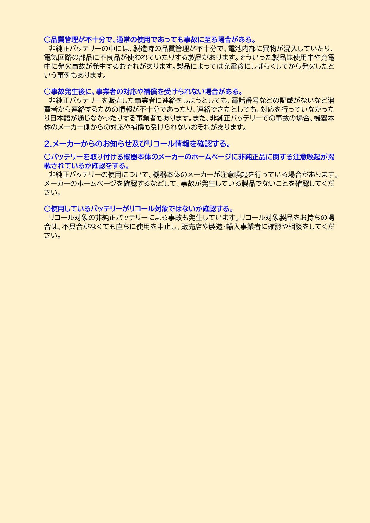 【参考】 NITE SAFE-Lite 経済産業省 リコール情報 消費者庁 リコール情報サイト 【リコール対象の非純正バッテリー(例)】 有限会社すみとも商店及びロワ・ジャパン有限会社が輸入した掃除機用の非純正バッテリーは、使用中や充電中ではない保管状態であっても発火のリスクがあるため、それぞれ2021年8月、10月よりリコールを開始しています。 ■放電方法及び廃棄について(引用:経済産業省) ■該当リコール情報(引用:経済産業省) ○有限会社すみとも商店(倒産) ○ロワ・ジャパン有限会社 ○リコール情報を知らせるサービスを利用する 消費者庁のリコール情報サイトでは、製品の担当省庁等が公表したリコール情報を一元的に集約して提供するメール配信サービスを実施しています。リコール情報を迅速に受け取ることができますのでぜひ活用しましょう。 【参考】 消費者庁 リコール情報メールサービス ■NITEでは2024年6月27日に注意喚起として『「低価格・高リスク」の非純正バッテリーに注意〜建物が全焼に至った火災も〜』をプレスリリースしました。 ■その他の情報も併せてご参照ください。 (映像資料:リンク先で動画が視聴できますので是非ご覧下さい) (1) バッテリーパック「1.電動工具用非純正バッテリーパックから発火」 (2) バッテリーパック「2.非純正品の発火」 (3) 中古品「1.使用時の注意ポイント」 (4) LEDヘッドライト「充電器の使い回しで発火」 (注意喚起ミニポスター) (1) リスクの高い非純正バッテリーに注意 |