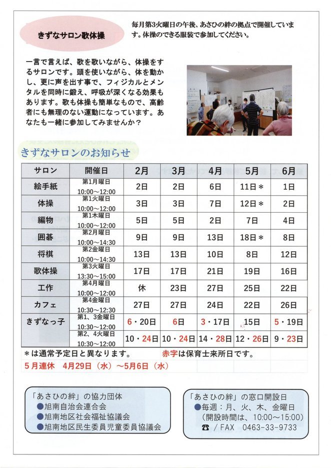 あさひの絆第47号を受け取りました。まだ多くの 皆様の所には届いていないと思いますが追って自治 会経由で届くと思います。 会長挨拶がありうれしいニュースが記されていました。 ボランテイァ研修会開催の様子ときずなサロン歌体操 の様子があります。あとはいつもの5ヶ月間のきずな サロンのお知らせ(日程)です。あっ、PDFも添付し ました。(黒木) | |