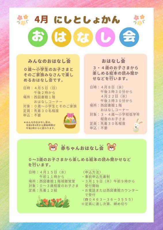 - 2026/03/19 【西図書館】4月おはなし会のお知らせ