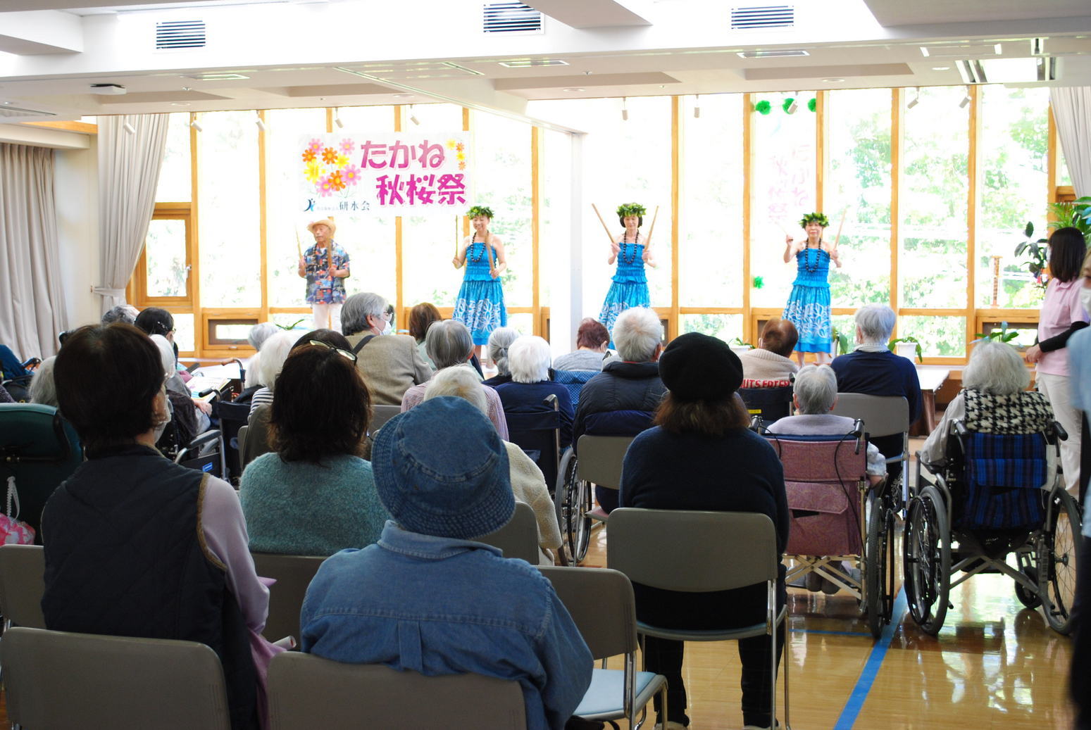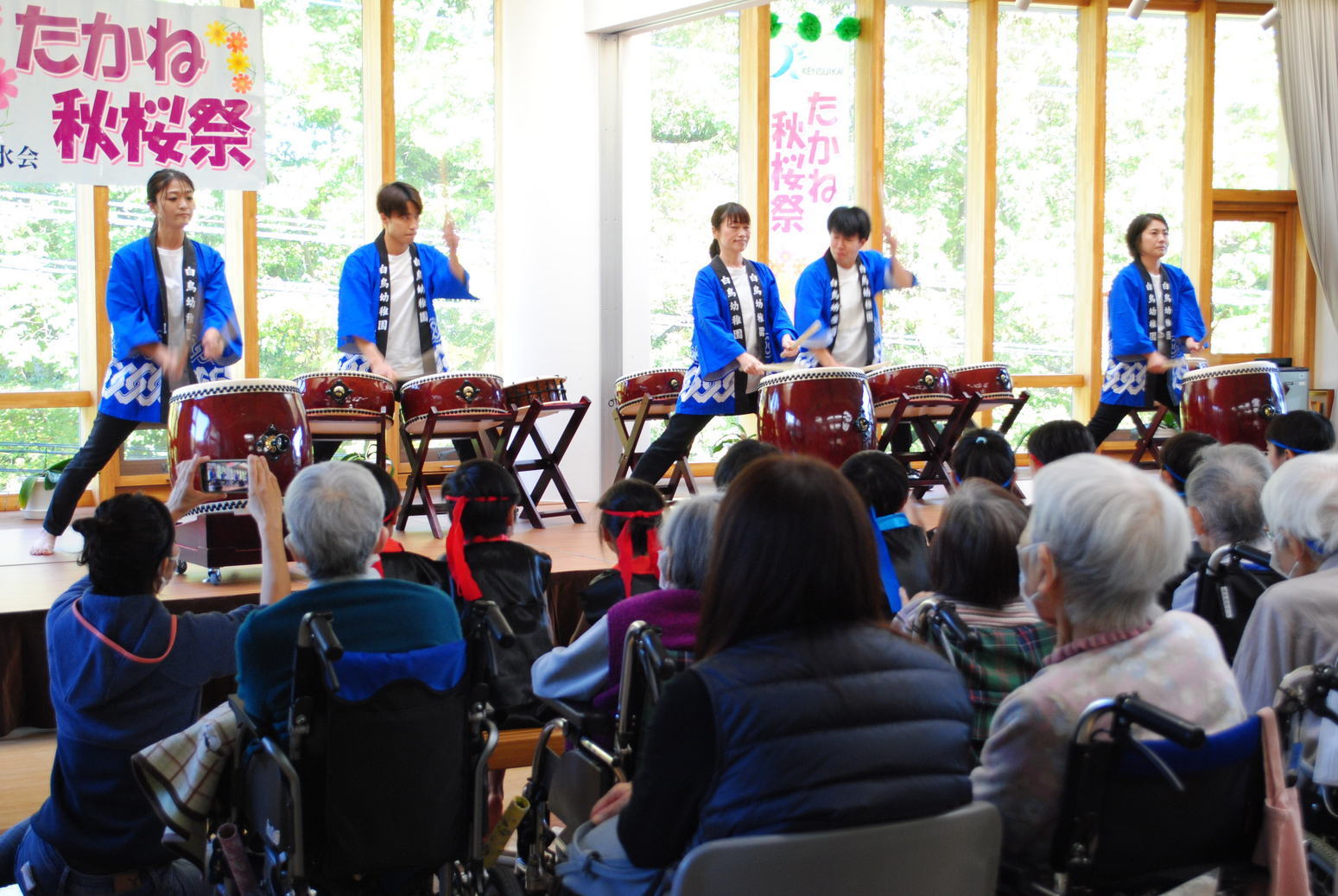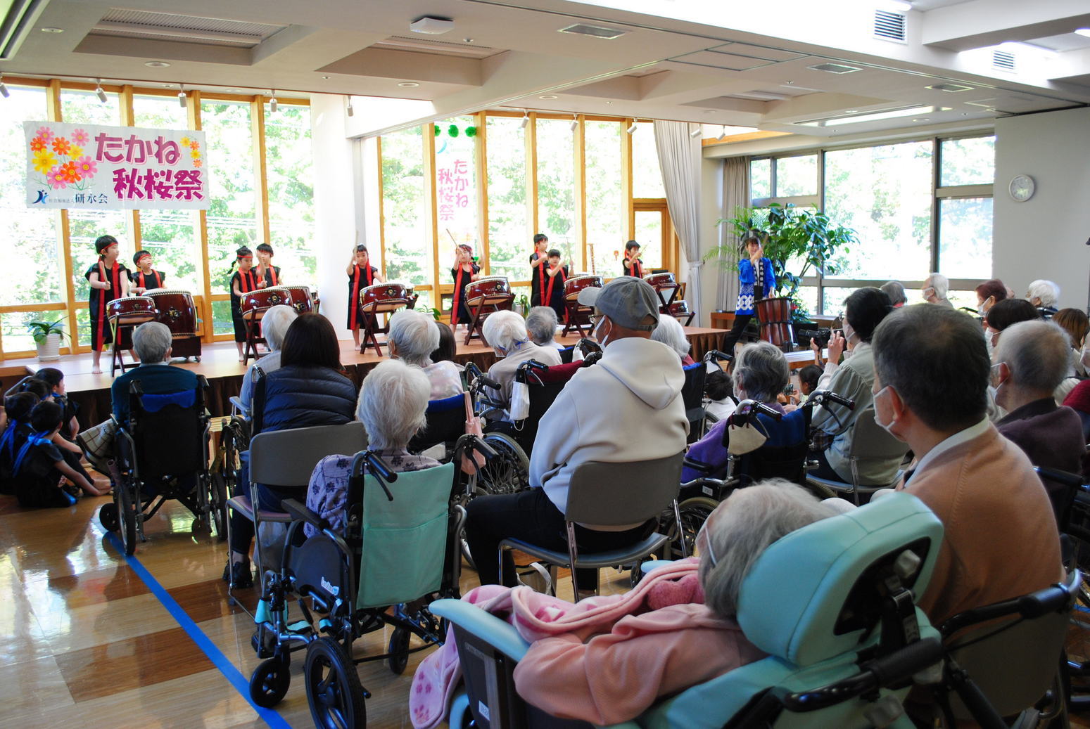 たかね秋桜祭に行ってきました。 10時30分に開会の挨拶があり 続いて白鳥幼稚園児による和太鼓 の演奏がありました。先生の迫力 ある太鼓演奏にホーム入居の車椅 子の方がリズムをとって聞いてお られたのが印象に残りました。 小春日和の外ではバザーはじめワ ークショップ他色いろなお店が出 ていました。よろずセンターさん の昔の遊び広場では多くのお子さ んが楽しんでいました。(黒木) |