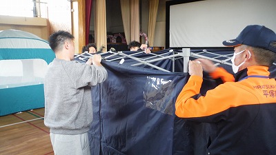 12月6日(土)の午前中、災害対策課指導の下、自治会の方と学校職員で避難所開設訓練を行いました。災害が発生した時の行動を確認し、避難所をどのように解説していくかを教えていただいた後、設営撤去を体験しました。