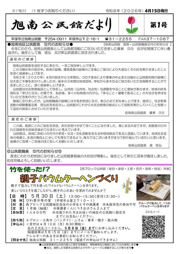 〇旭南公民館 館長・公民館職員交代のお知らせ 〇竹を使った!?親子バウムクーヘンづくり 〇山城中学校演劇部自主公演 〇2026 4.6 運賃改定 BetWEeN liner 〇第50回平塚市緑化まつり 〇防犯旭南支部ニュース ぜひ、ご覧ください。よろしくお願いいたします。 (山田) |