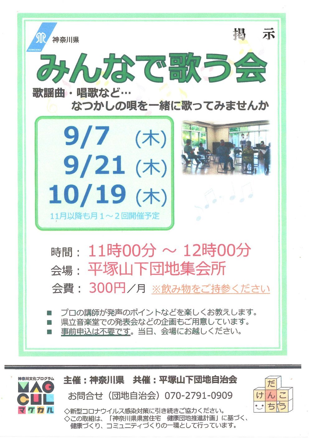9月7日(木)9月21日(木)10月19日(木) 11時から12時。山下団地集会場にて。会費300/月。 歌謡曲、唱歌などをプロの講師が楽しく教えてくれます。 横浜紅葉丘の県立音楽堂での発表会も企画しているそうです。 みなさんお誘いの上、楽しく歌いましょう。 主催は神奈川県 共催は平塚山下団地自治会 (飯曽根) |