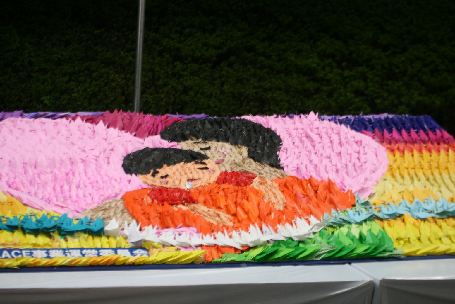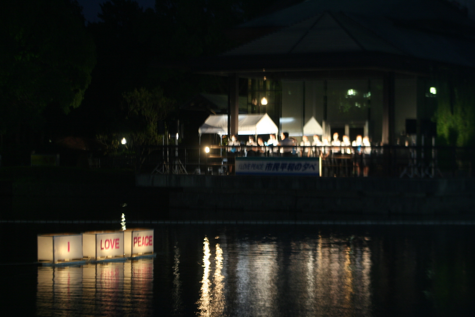 8月11日(金)山の日で祭日で した。総合公園内の池で灯ろう流 しが行われ、多くの方が灯ろうに 願い事を受け付けで書き、組み立 て式の灯ろうに被せて、池のステ ージに行、ロウソクに灯を点けて もらい、池に浮かべました。 18時30分に落合市長の挨拶が あり、一般の方の灯ろう流しが始 まり、平和を願い灯ろうを流しま した。 その間平塚中等教育学校・平塚湘 風高校合唱部によるコーラスが流 れ、願いを運んでくれました。 ウクライナの平和を願う灯ろうが 多く見られました。 地球儀の丘にもカップに入ったロ ウソクに灯が入り、平和を願う人 で溢れていました。 皆さんが折った千羽鶴が、デザイ ンに沿って貼り付けた「優しい時 間」も完成しました。 19時半からは平和アニメ映画が はじまり、親子連れで多くの方が 「一つの花」を観入っていました。 改めて平和を感じた夜でした。 (黒木) |