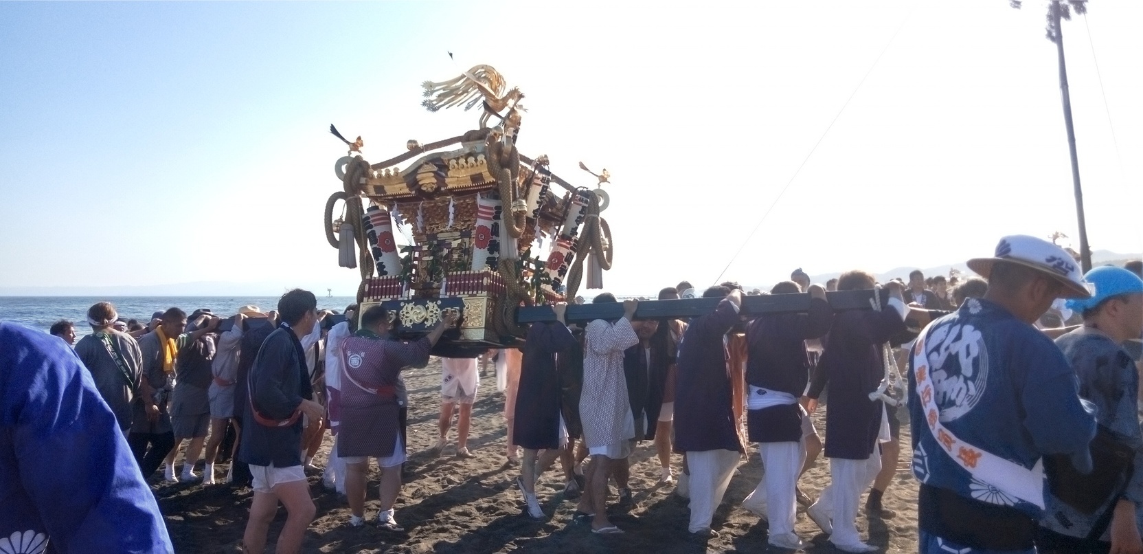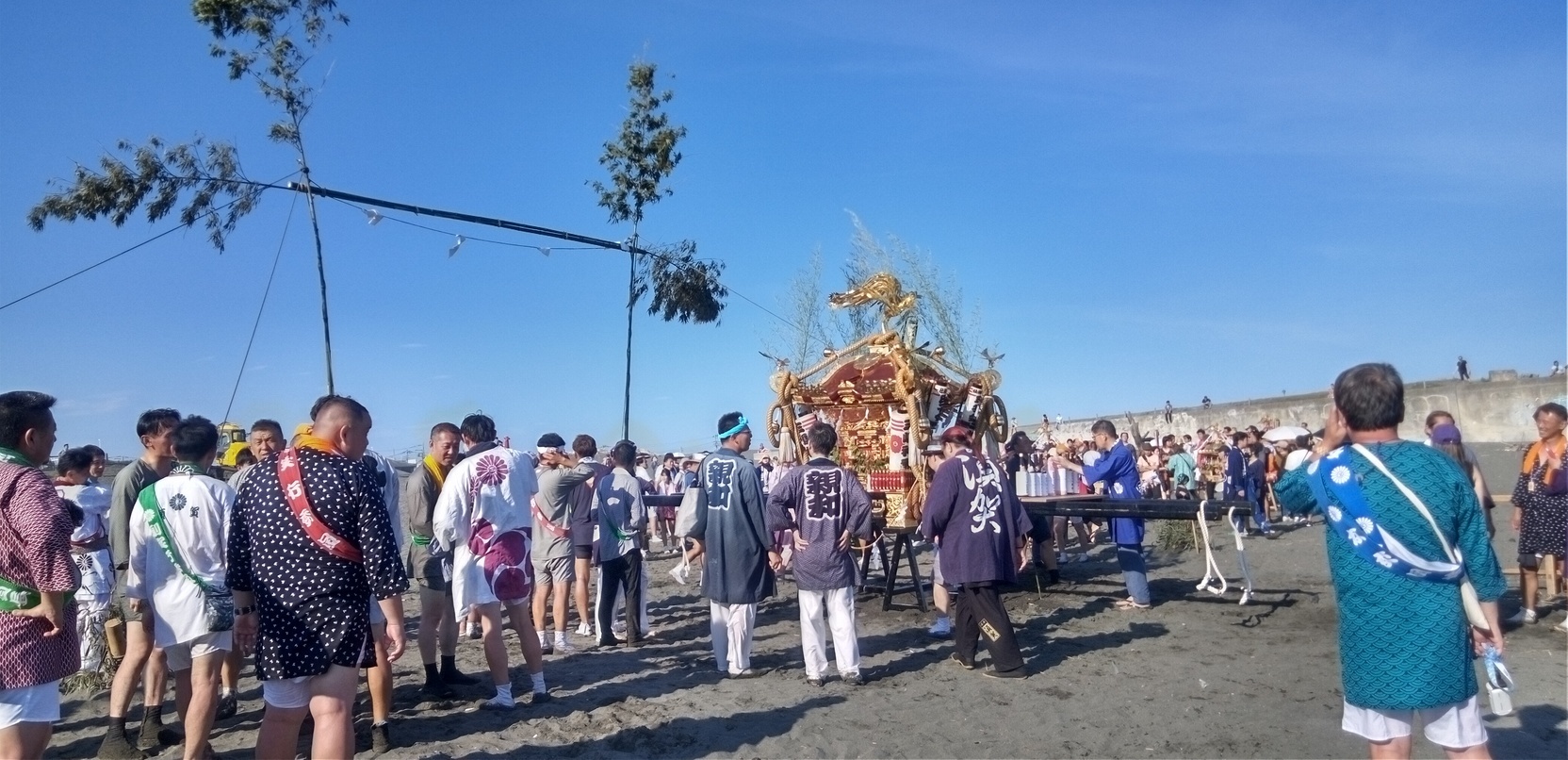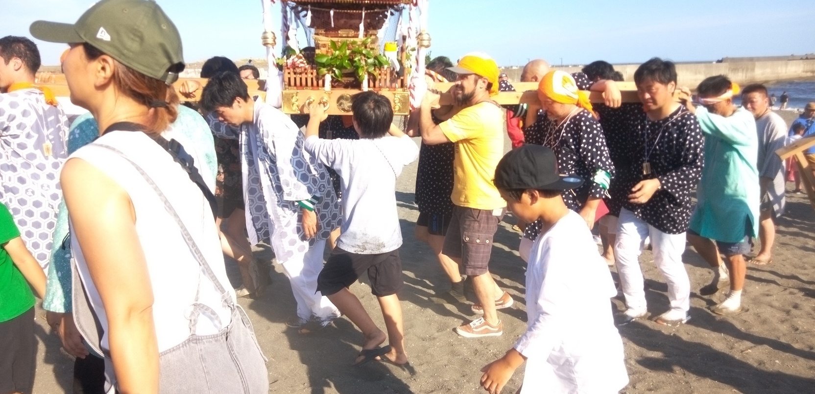 2日目、孫も神輿と海に入ると言うので、浜降祭にも行きました。 大神輿と子ども神輿(大人も担ぐ)何基もが浜に作られた竹の鳥居をくぐり、禊をしました。 帰りは漁港でひと休み、子どもパレードあり、三嶋神社に戻りました。(黒木) |