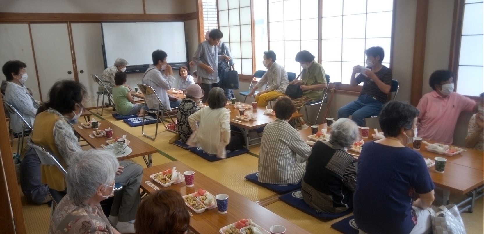 7月5日(水)12時〜 旭南公民館1階和室にて2ヶ月に1度の 71歳以上のひとり暮らしをされて居る方が民生委員の方をとおし て申込をされるシステムで行われている給食会を開催しました。 コロナ禍以降大ホールで行われていましたが、当日他団体さんと重 なっていた為、急遽1階和室となりました。 @調理室ではほぼ料理が出来上がっていました。皆さん早くからご 苦労様でした。 A受付後大ホールに入れない為、ロビーは混雑しています。 B足腰の悪い方は座布団での食事は難しいので、椅子を用意して座 って貰いました。仲良しさんと一緒が良いのでアチコチに椅子が 運ばれました。 C食事が終わり平林会長に皆さん「ご馳走様」と帰られました。 PDFに少し写真を追加しています。 (広報黒木) |
