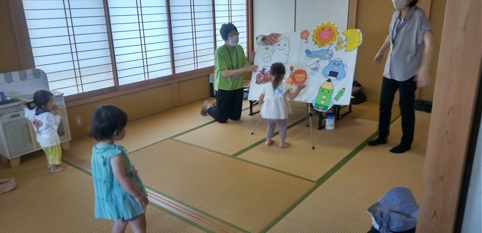 「たんぽぽ」を開きました。真夏日になった日射しのの中を、 お友達がママと一緒に汗ふきふき(ママが)来てくれました。 いつものお遊戯体操をしてから、エプロンのお話し。なにが出 来るかな? その後は真っ白いボードに名前が言えるかな? 分かるかな?次つぎとたくさん出て来ました。言えましたとパ チパチ拍手でした。高根自治会館ってこんな姿をしています。 他の写真はPDFを開いて下さい。(広報黒木) | ||