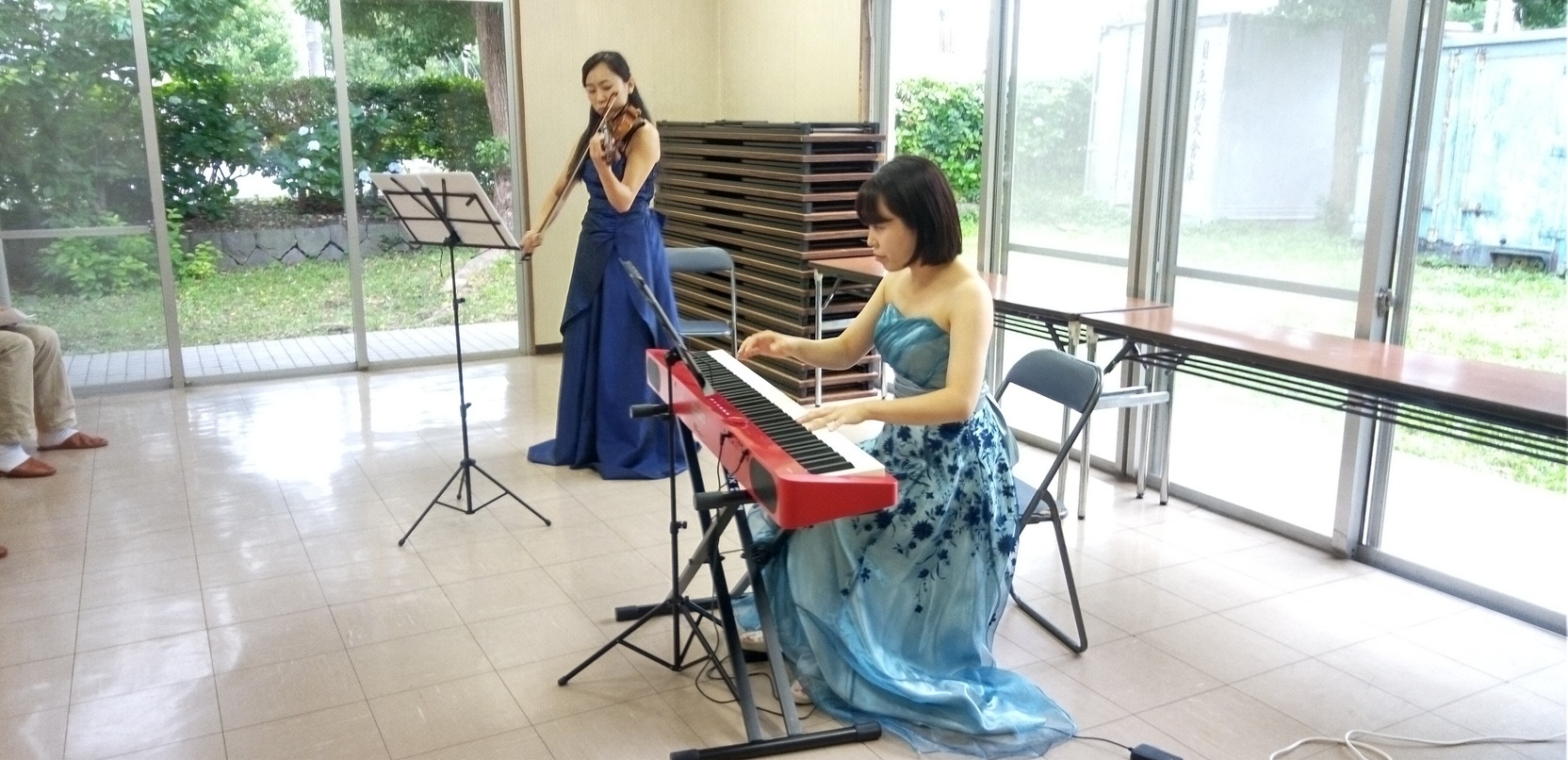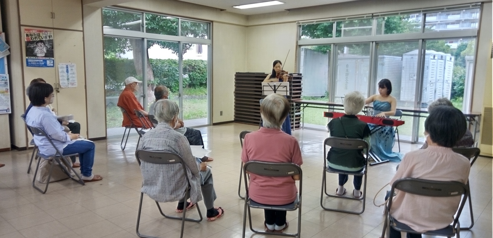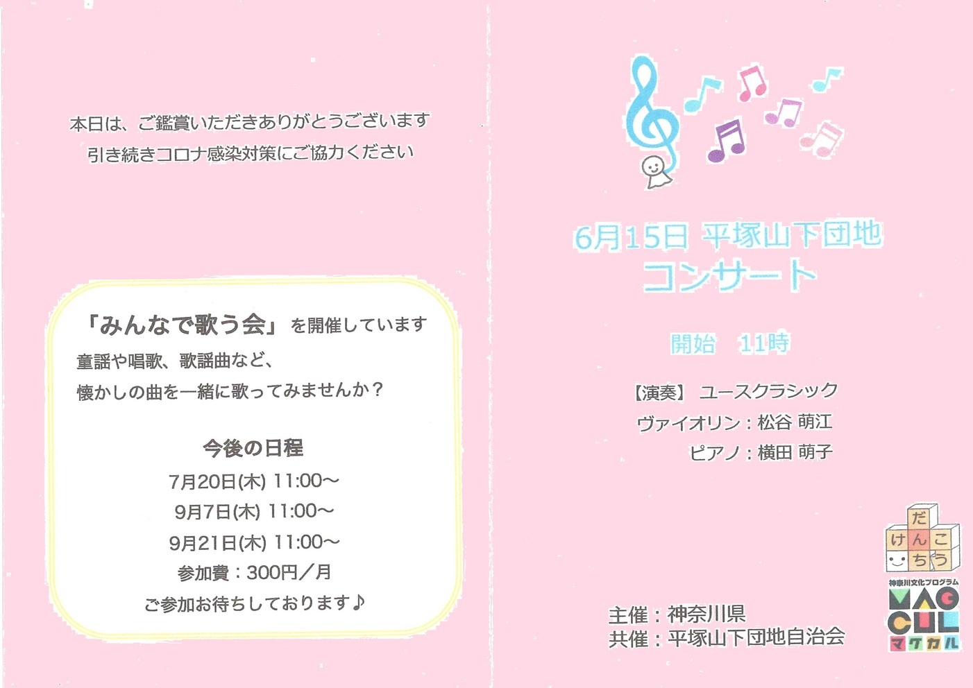 開かれました。主催神奈川県共催平塚山下団地自治会。 今にも降り出しそうな梅雨空から少しづつ日射しが出る 天候になり、沢山の方が集まって演奏や会話に耳を澄ま して聞いて居られました。 演奏者のうしろの芝生には数羽のすずめたちが演奏に合 わせる様に飛び回ったり、芝をつっいたりしていました。 今後の日程もプログラム後ろにあります。(飯曽根) | ||