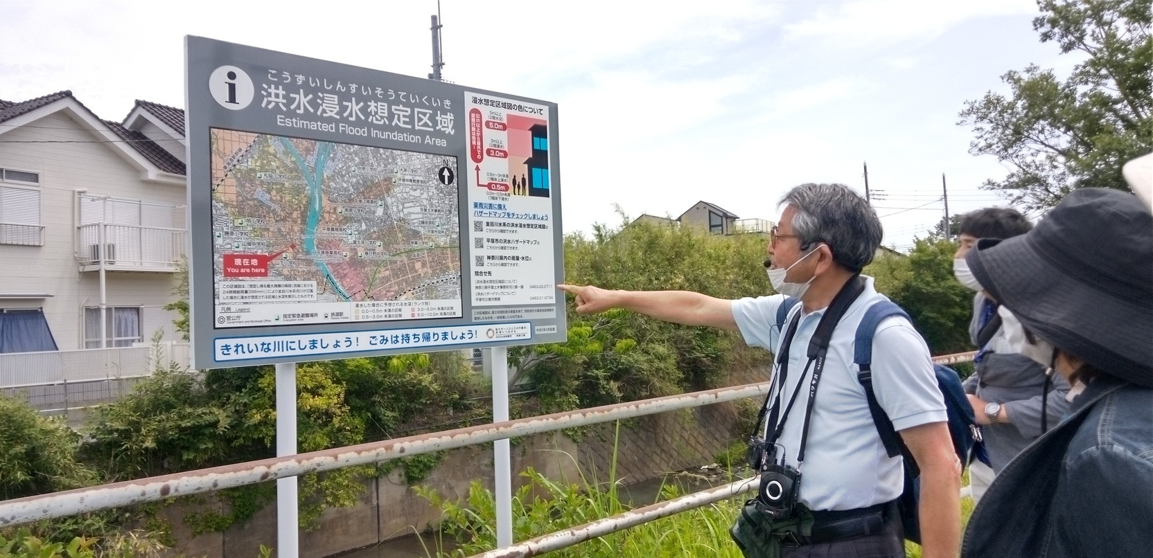☆水害に備えよう!旭南防災まち歩き☆に参加してきました。 ひらつか防災まちづくりの会のスタッフのみなさんが周到な 準備をされて大スクリーンで旭南地区の成り立ちから近年に 発生した水害の様子。それに液状化現象を目の前で実験しな がらの説明等色いろありました。 高根川と河内川合流地点を中心に歩きながら説明をして貰い ました。水害の被害が大きかったみらい保育園も休日にも関 わらず園長先生がその時の実情と現在の対策を話して貰いま した。3月に設置された下河原橋傍の洪水浸水想定区域の立て 看板やポンプ場。河内川河川拡張工事の現場も見て来ました。 旭南地区住民としては大変意義のある講習でした。(黒木) | ||