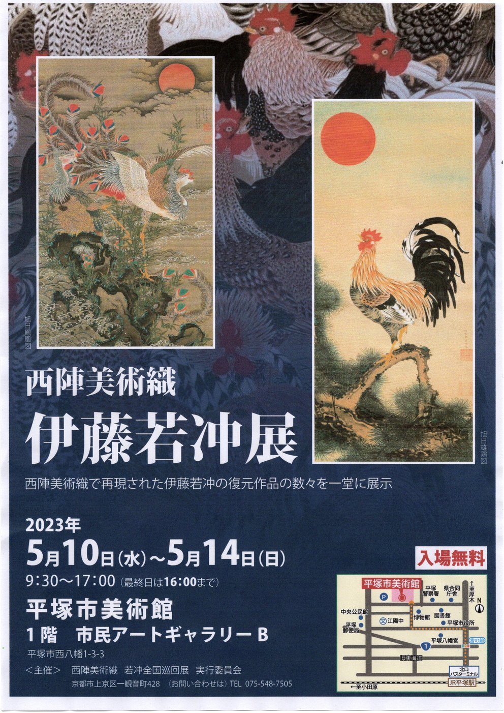ちいき情報局の「やわた」さんの掲示物をみて、西陣美術織伊藤若冲展を平塚美術館で開催している事知り、見て来ました開催日が14日迄の5日間しか有りませんがまだ間に合うと思います多くの方が来ておられました。