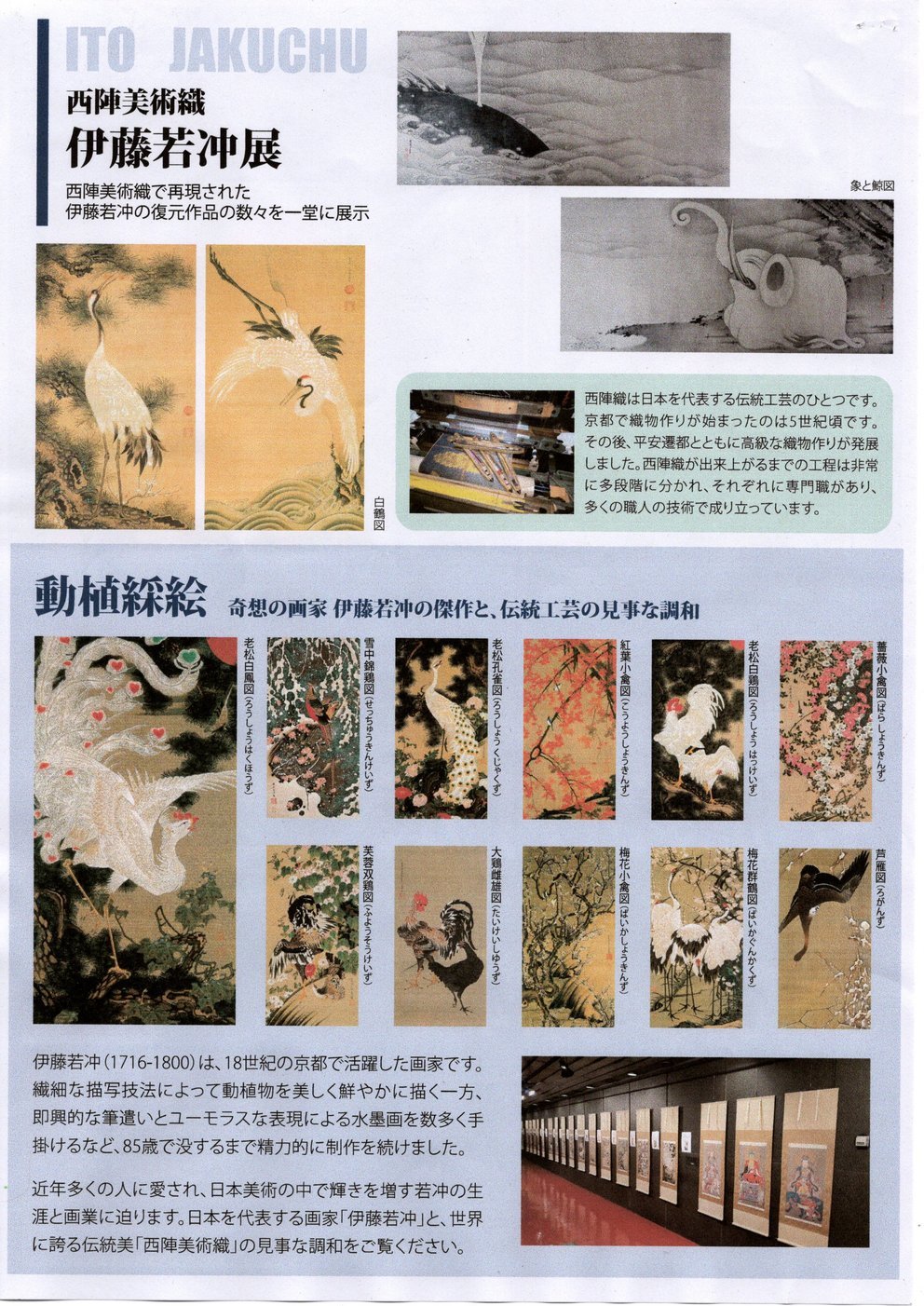 京都市立美術館の若冲展も見ていますので、西陣美術織でどう表現されたのかすごい興味がありました。撮影禁止なので会場内の写真は掲載出来ませんでしたが案内をされて居る常務取締役の吉田氏から色いろとお話を聞く事が出来ました。スマホの方はチラシをPDFで見て下さい。(黒木) |