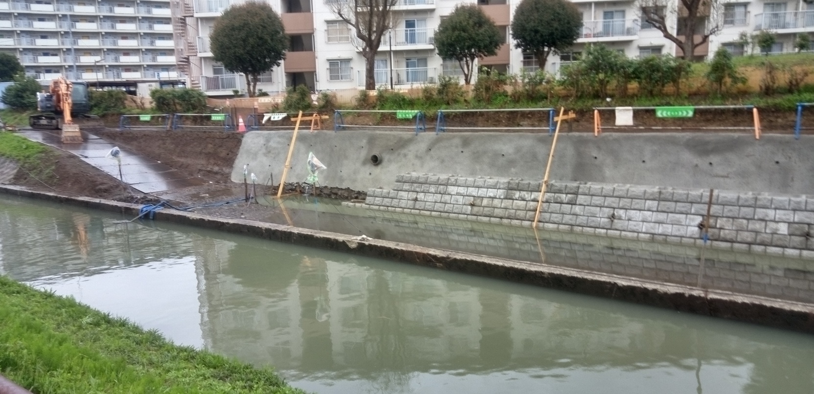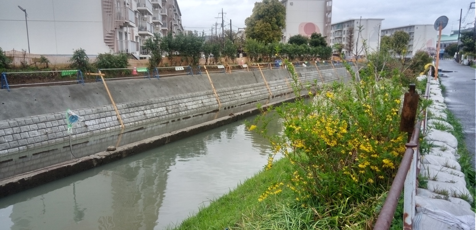 正式な工事名は令和3年度河川維持改修工事です。1度5年3月31日 まで延期になり、進捗状況を写真3枚3月25日撮りました。4月に看 板の工期が5年11月30日に替わり、工事が続いています。 現場が狭隘(きょうあい)である。想定外の地盤条件等の理由とあ りました。(黒木) | ||