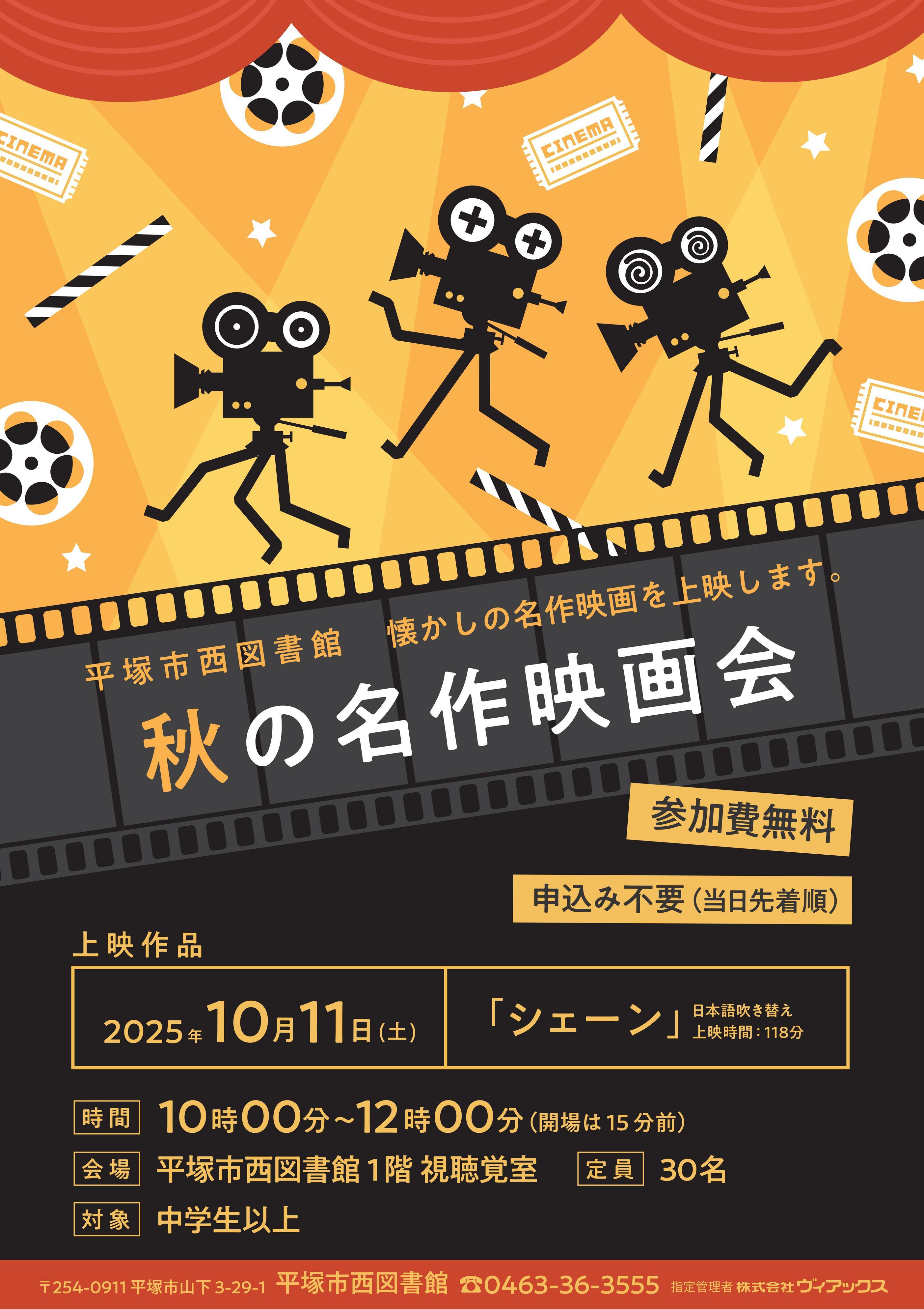 西図書館では、懐かしの名作映画を上映する「秋の名作映画会」を開催します。 【開催概要】 ●10月11日(土) 上映作品『シェーン』 上映時間:118分/日本語吹き替え 午前10時00分〜正午に開催します。 ※15分前開場・受付開始 【定員等】 申込み不要(当日開場後先着順) 定員:30名 対象:中学生以上 【会場・問合せ】 平塚市西図書館 1階 視聴覚室 0463-36-3555 当日のご参加をお待ちしております! (三浦) |