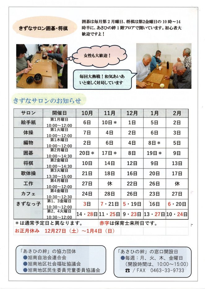 表紙は10月に行われた「絆まつり」の様子で裏面はきずな サロン囲碁・将棋の様子とサロンのお知らせ10月から2月 迄の日程です。お正月休みの日程も明示してあります。(黒木) | |