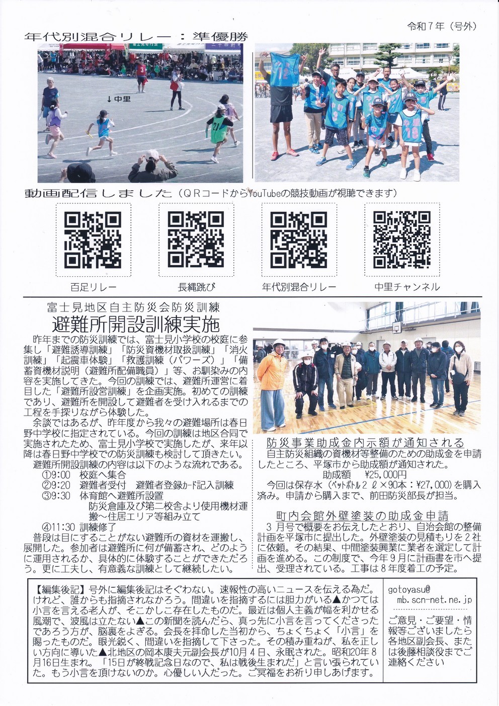 1面:第72回市民レクリエーション富士見大会 中里大躍進 笑顔はじける 2面:富士見地区自主防災回防災訓練 避難所開設訓練実施 防災助成金内示額が通知される 町内会館外壁塗装の助成金申請 編集後記 |