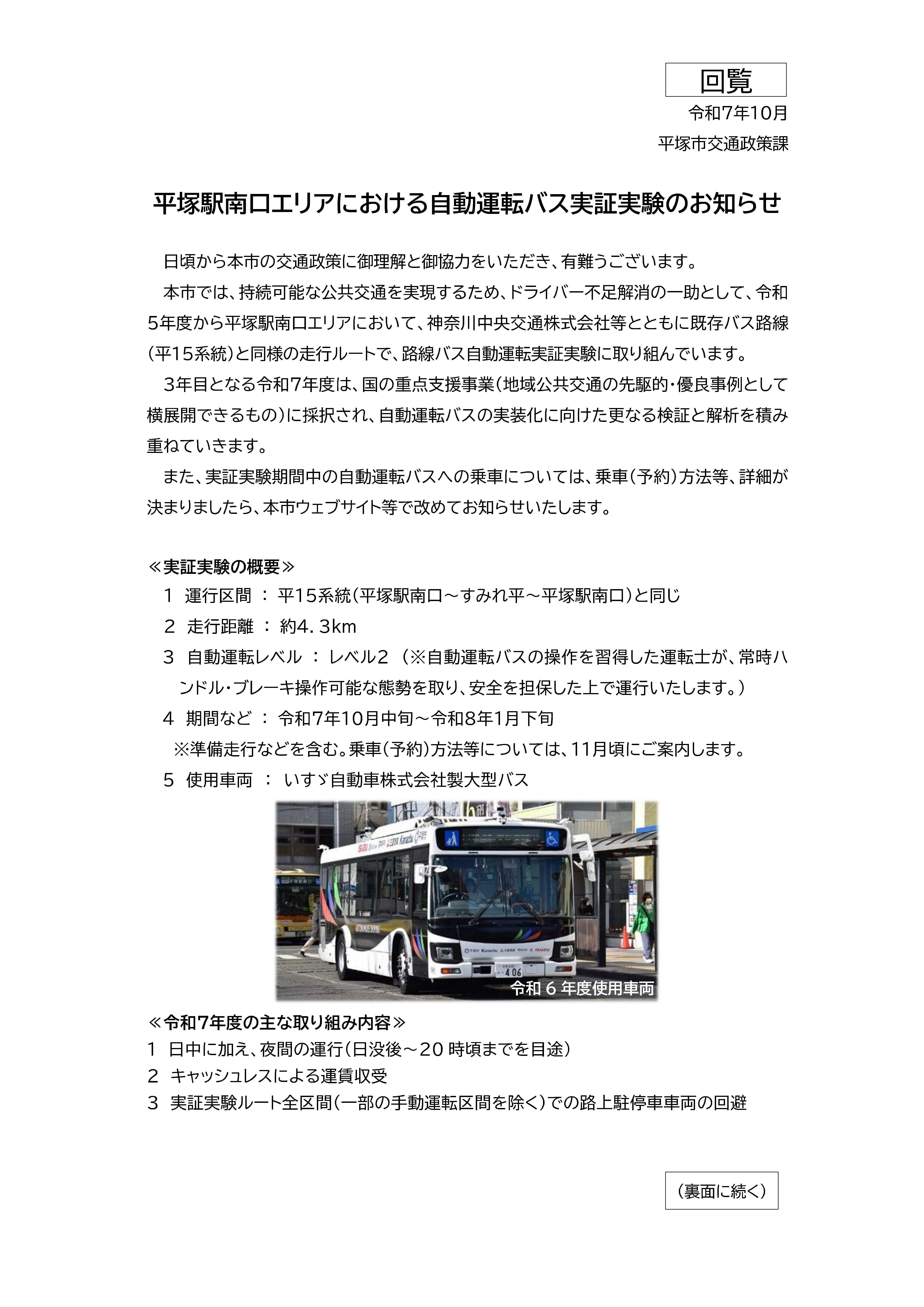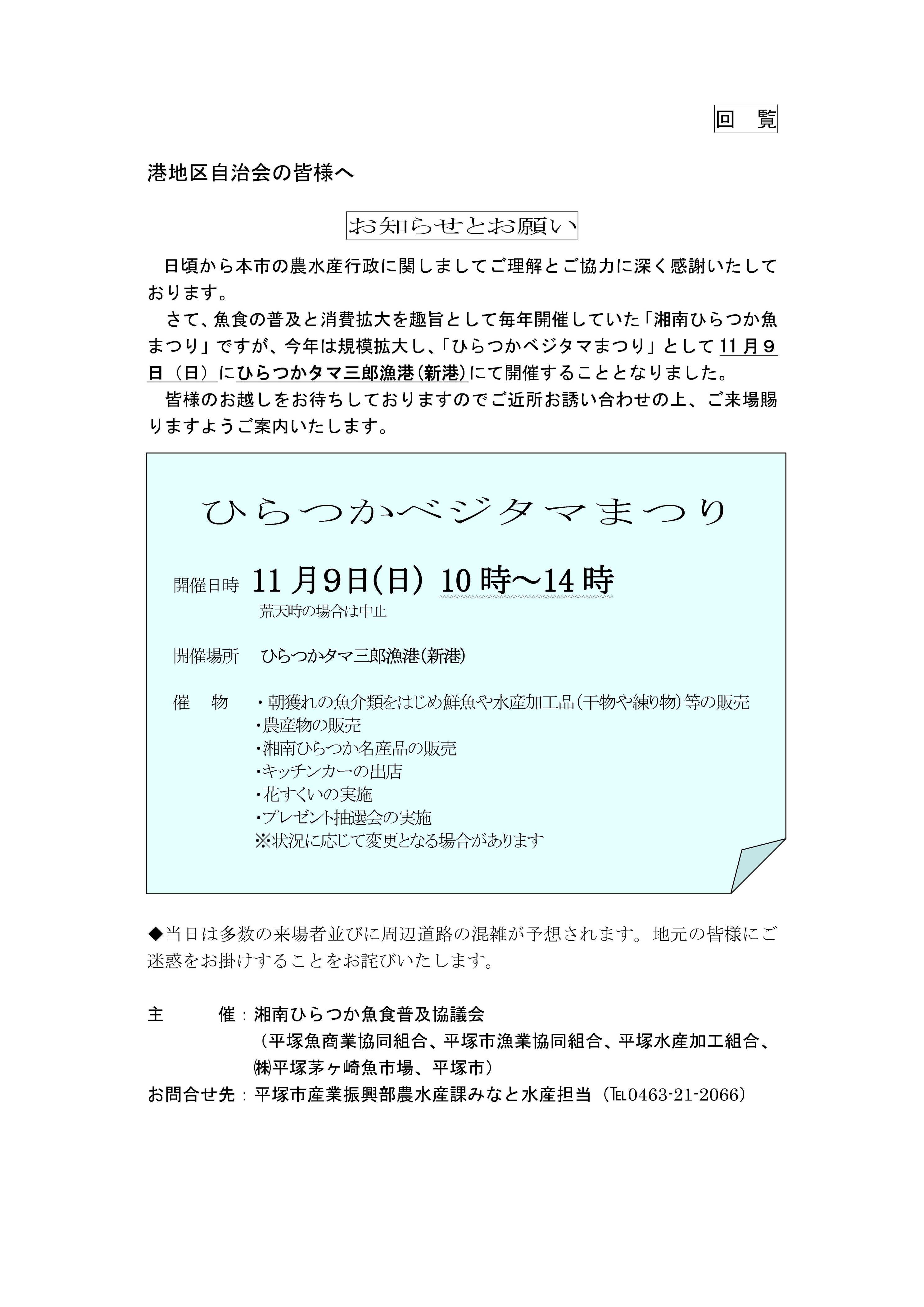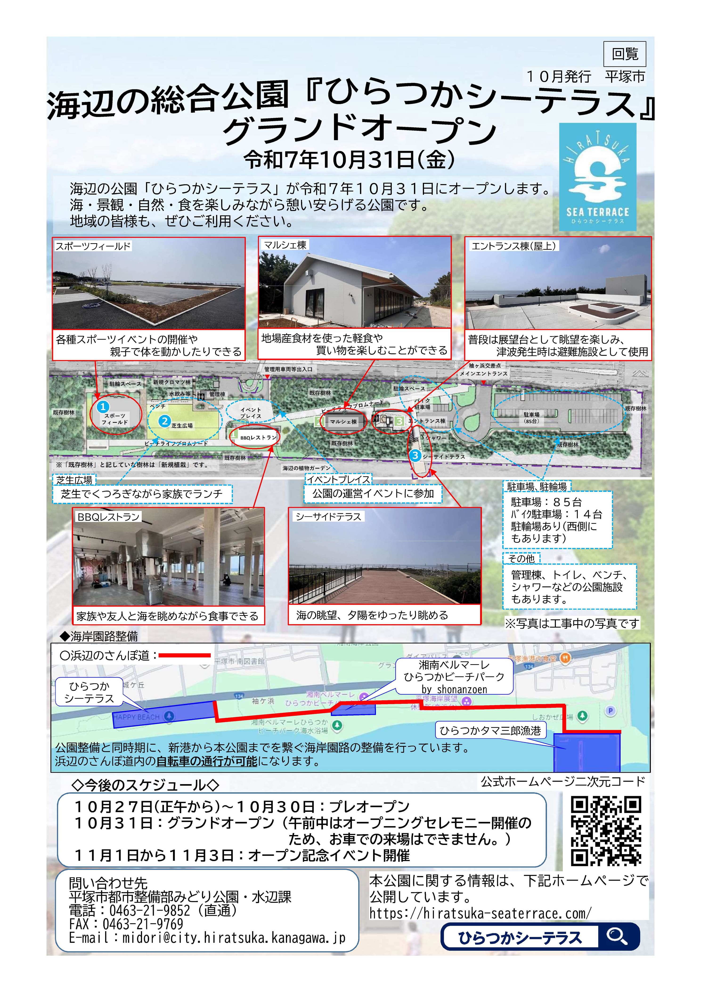 10月の一部自治会回覧物は次のとおりです。 紙媒体でも自治会長に同様のものをお送りしています。 メールやLINE等での回覧にご利用ください。 ・海辺の総合公園「ひらつかシーテラス」グランドオープン 【対象自治会】 なでしこ地区自治会連絡協議会の各自治会、花水地区自治会連絡協議会の各自治会、港地区自治会連絡協議会の各自治会、オハナ平塚袖ヶ浜自治会 ![]() |