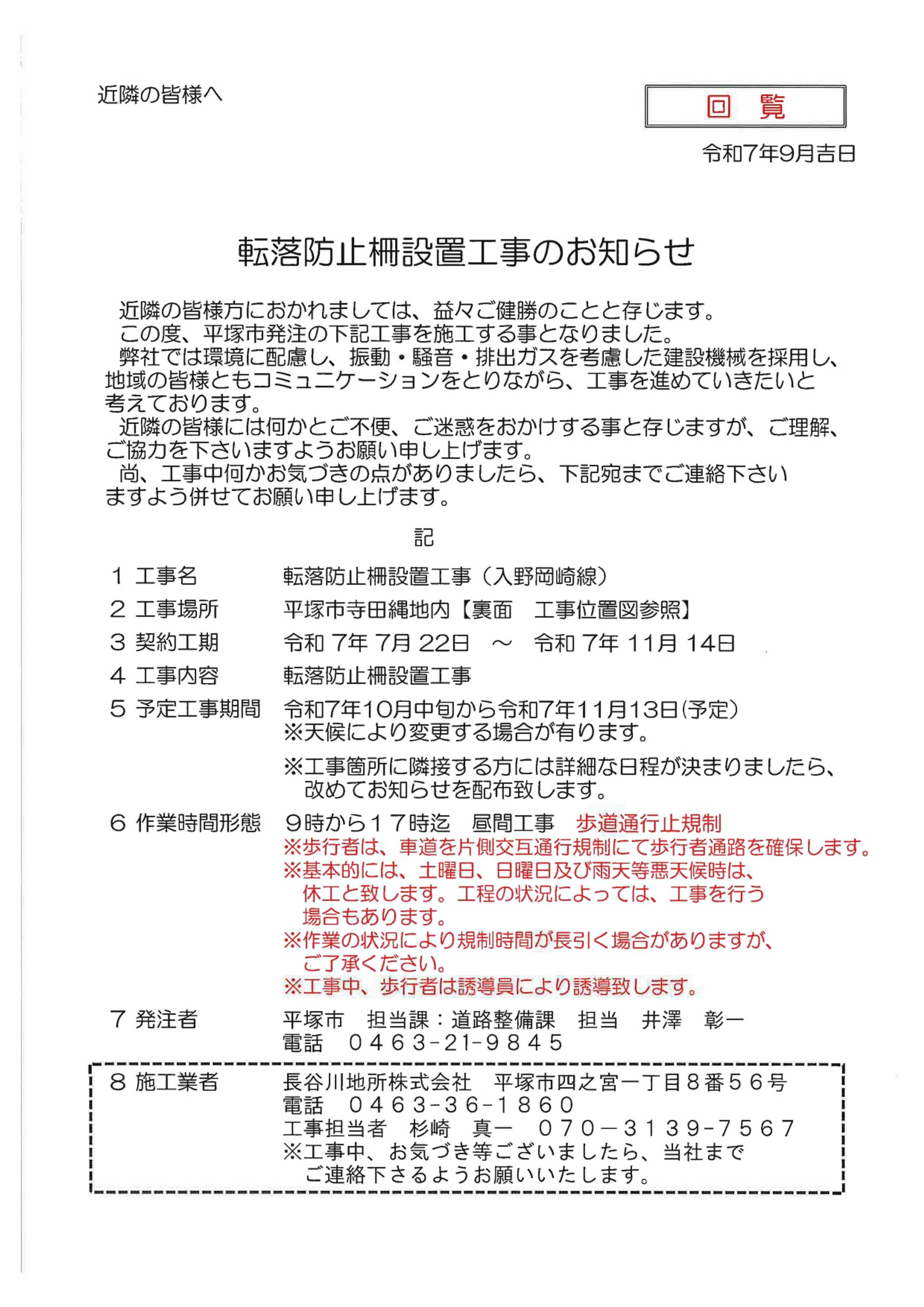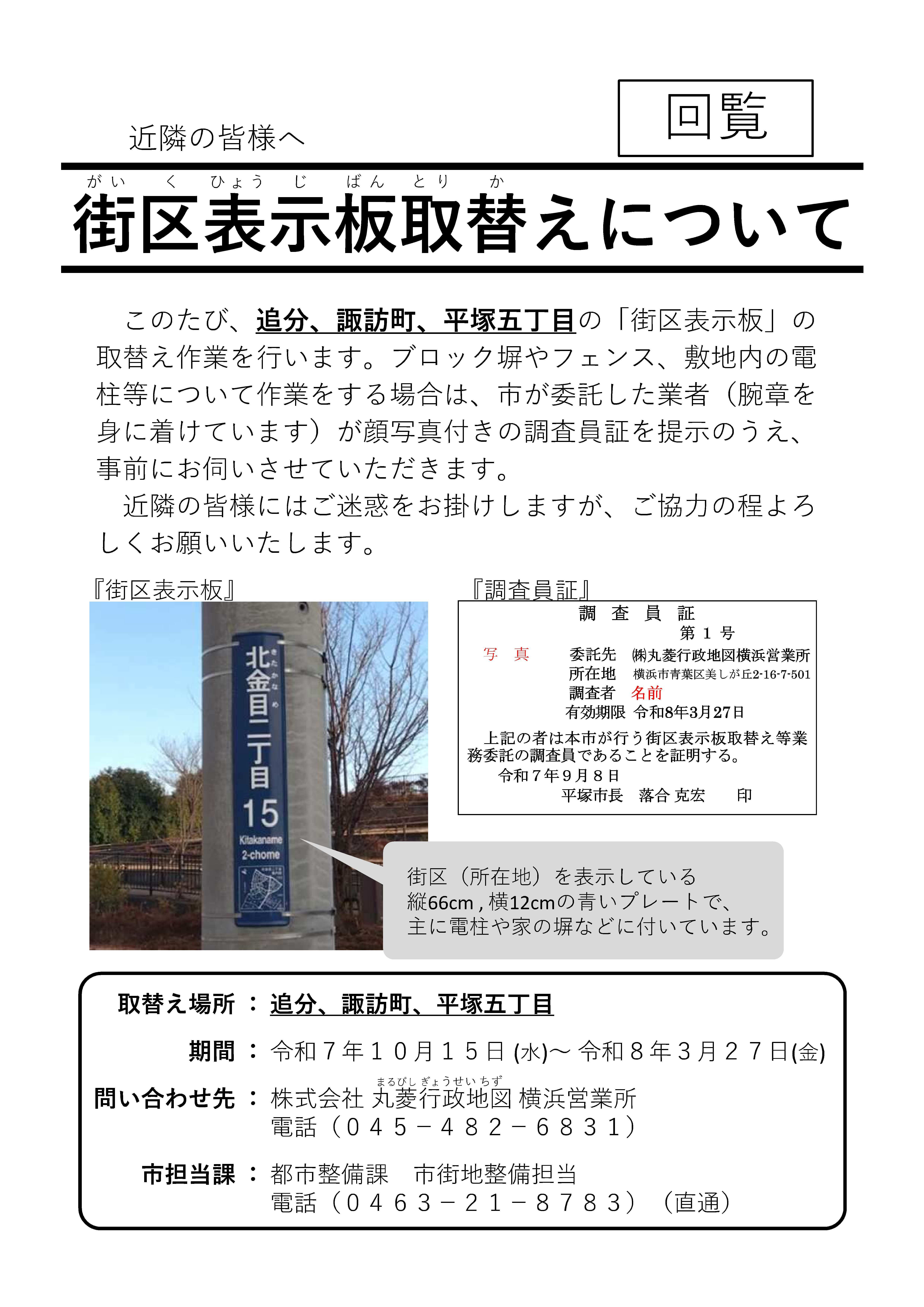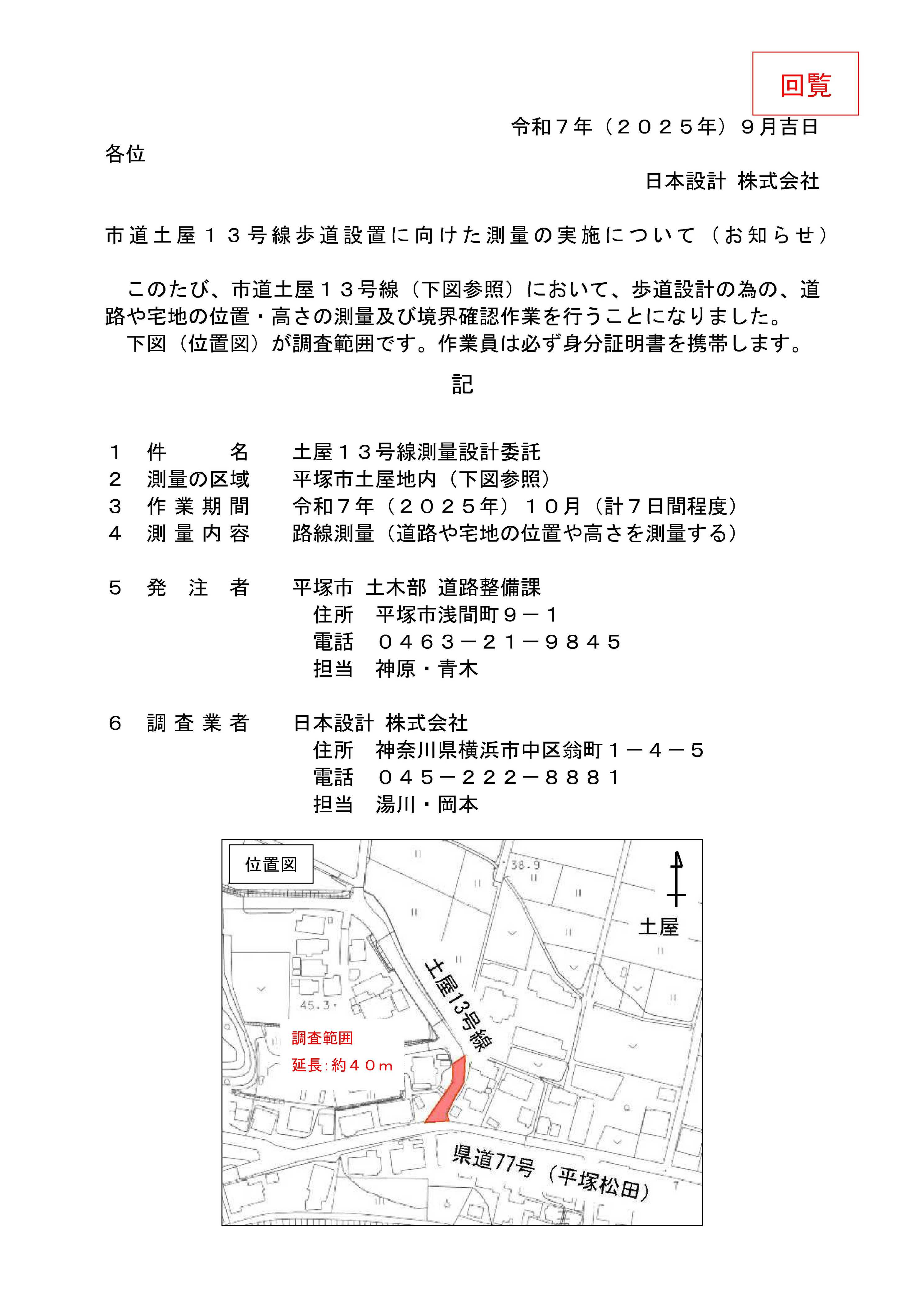 10月の一部自治会回覧物は次のとおりです。 紙媒体でも自治会長に同様のものをお送りしています。 メールやLINE等での回覧にご利用ください。 ・市道土屋 13 号線歩道設置に向けた測量の実施について(お知らせ) 【対象自治会】 大庶子分自治会、大寺分自治会 ![]() 【対象自治会】 なでしこ地区自治会連絡協議会の各自治会、花水地区自治会連絡協議会の各自治会、港地区自治会連絡協議会の各自治会、オハナ平塚袖ヶ浜自治会 ![]() ![]() 【対象自治会】 柳町町内会、西仲町町内会、諏訪町会、立野町・追分町内会 ![]() |