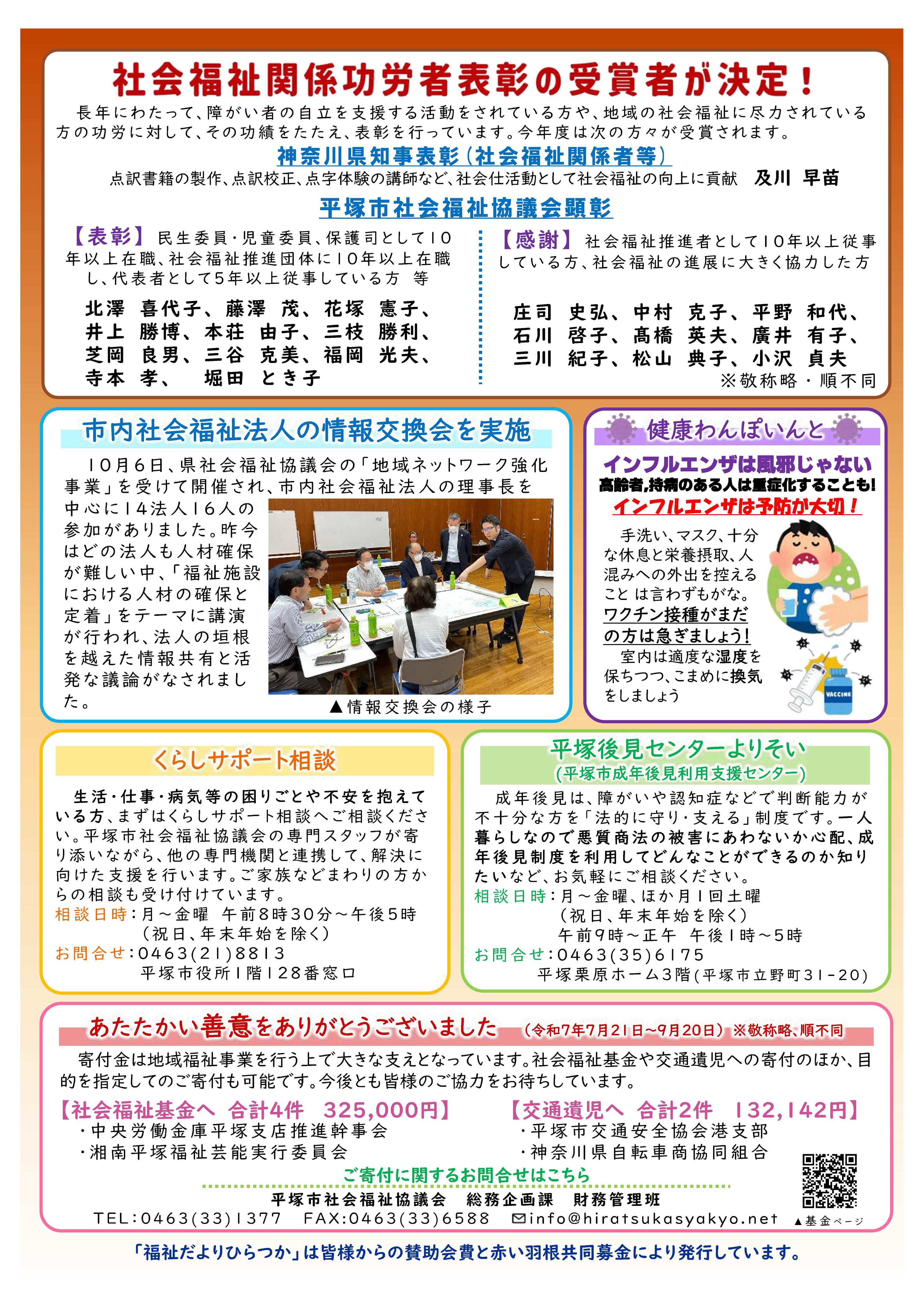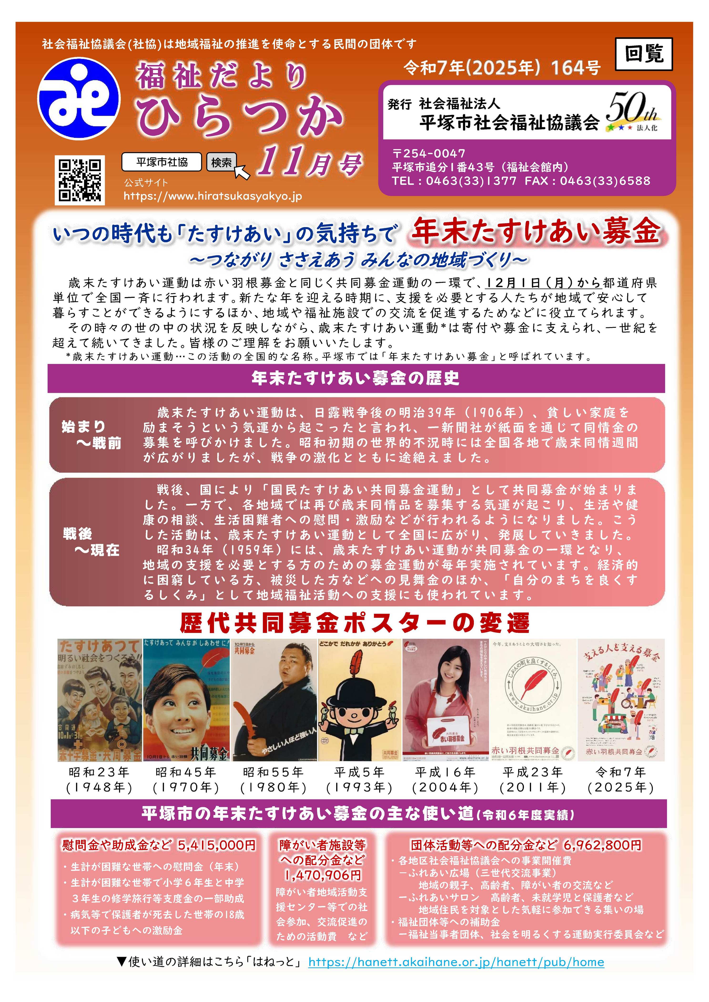 11月の全自治会回覧物は次のとおりです。 紙媒体でも自治会長に同様のものをお送りしています。 メールやLINE等での回覧にご利用ください。 ●全自治会回覧物 ・ひらつか市民活動センターまつりチラシ![]() ・「まちぐるみ大清掃」チラシ※地区によって回覧物が異なるため、詳細はPDFデータで御確認ください。 ・福祉だよりひらつか164号 ![]() |