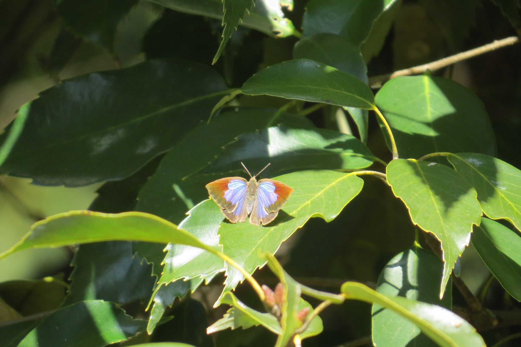 ≪ 金目の自然 蝶 ≫ 陽気につられてシジミチョウ科の吸蜜と日向ぼっこ 1月16日は3月中旬の陽気となりました。 金目親水公園およびその近辺では1月15日まで冬眠・休眠している成蝶はウラギンシジミ1頭だけと報告したばかりです。 こんな日、春の陽気にあわよくば何処かで冬眠・休眠していたシジミチョウの仲間が目覚めて公園内で活動しているのでは思い、正午前に蝶の観察に出かけました。 期待通り最初に見つけたのは、ホタル水路脇の椿の花上で吸蜜や日向ぼっこをしているムラサキシジミ(雌)を最初に見つけました。その写真が上左写真です。 心ゆくまで鑑賞した後、更に他の場所にも居ないかと心当たる園林の中を探し回りましたが、発見できませんでした。それでも諦めきれず、毎年見かけていた取って置きの公園池の東側にあるアラカシの中層域で白と橙色をしばらくチラつかせて飛び回った後、やっと葉表に留り、翅を広げて日光浴を始めたウラギンシジミ(雄)を発見。その時の写真が下左写真です。写真を撮っている最中、偶然にも1mも離れない葉表に羽を広げて止まったのが下右写真のムラサキシジミ(雌)です。これはホタル水路脇の椿の花上で見たムラサキシジミとは異なります。 公園内で見つけられなかった冬眠・休眠中のシジミチョウの仲間が園内のどこかでこの冬を越していることが確認されました。 皆さん、暖かい晴れた風のない日に公園へ散歩に来られた時、日向ぼっこをしている蝶を見ることができるかもしれません。その時は少し離れた所で身動きせずにそっと見守ってください。(Y.Y.) | |