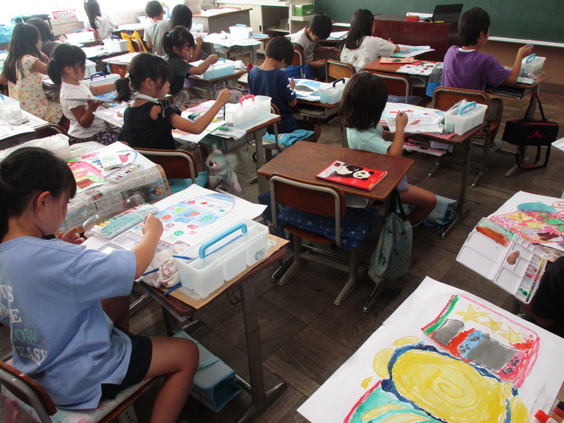 3連休明けの今日も残暑が厳しく、金目小学校校庭の暑さ指数(WBGT)も31(危険)近くまで上がってきています。6校時に予定されているクラブ活動も、外での活動ができるか心配になってきました。 そのような中ですが、エアコンの効いた教室では、1.2年生が図工の学習で絵を描いていました。 1年生は主にクレヨンを使った「おはなしだいすき」、2年生は主に絵の具を使った「ふしぎなたまご」という題材で、それぞれの感性をいかして素敵な絵に仕上げていきました。 | |