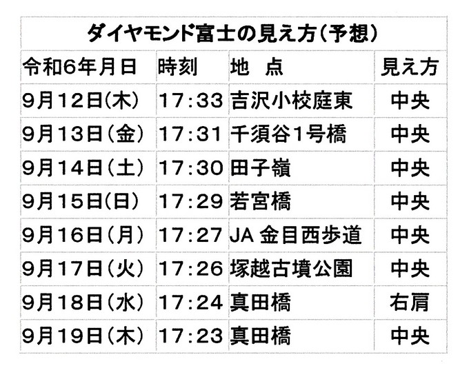 金目地区からダイヤモンド富士を見よう! ダ イ ヤ モ ン ド 富 士 鑑 賞 週 間(令和6年9月12日(木)〜9月19) 金目地区には富士景観を楽しめるポイントがたくさんあります。その中でも田子嶺や若宮橋(金目通学橋)脇、などに富士景観地(富士山ビューポイント)の標柱が立っています。ところがダイヤモンド富士を鑑賞できる日時が異なります。金目地区でダイヤモンド富士を鑑賞できるグッドタイミングな日時・場所・見え方を紹介します。 |