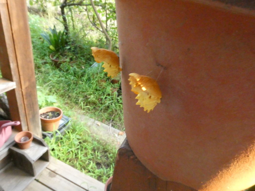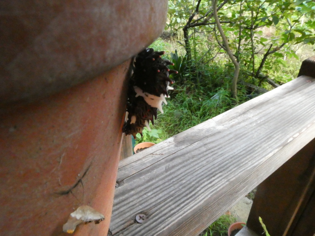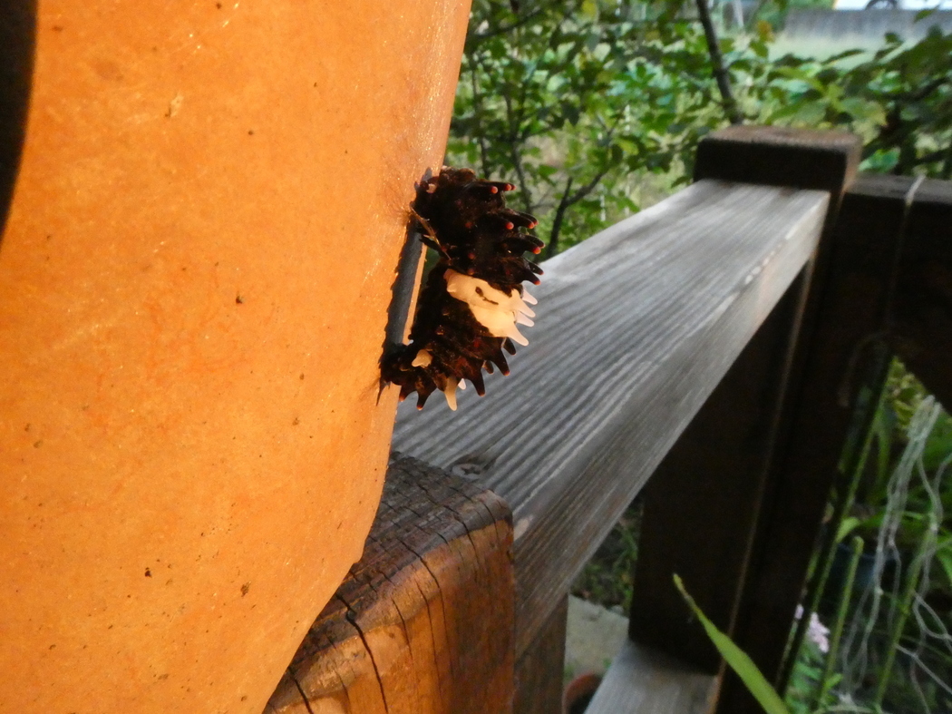 ジャコウアゲハは植木鉢が大好き 上の写真をクリックして拡大してみてください。この鉢には食い尽くされたウマノスズクサ(以後 食草と略す。)の茎にジャコウアゲハの幼虫が4匹(4齢幼虫、終齢幼虫)と鉢の側面に今日か明日には蛹へ蛹化するジャコウアゲハの前蛹が取り付いています。一つの鉢に6匹の終齢幼虫・4齢幼虫と前蛹が集まっているのを見たことがありません。この鉢に幼虫や前蛹が集まったのは、次にように考えられます。元々この鉢に卵から居たのではなく、それぞれ4匹の幼虫は周辺にあったウマノスズクサを食べつくしたためにこの鉢のウマノススクサに集まって来たと思われます。(2+4)匹が集まってアッという間に食草は食べつくされて写真にように丸裸となりました。 4齢幼虫たちは更に食草を求めてこの場所を去って行かざるを得ません。また、終齢幼虫は蛹となる場所を求めて周辺を彷徨い回ります。 一方、側面の前蛹は1,2日で蛹になりますが、我が家ではジャコウアゲハの蛹が鉢の側面にくっ付いているのをよく見かけます。その訳は、鉢の側面は周りの気温よりも低く、また湿度も適当に保たれるからです。というのは土の入った素焼き鉢の側面からは土の水分が気化する際に気化熱が奪われて鉢の側面の温度が下がるのです。幼虫は本能的にこのような現象がある場所を知っているのでは? 否、私の勝手な思い込みでしょうか?。 さらに幼虫の賢さを感じるのは、化粧鉢の側面には蛹として付かないことでです。それは化粧鉢の表面がつるつるして側面からの蒸発が無く、表面温度は低くならないし、また登って(幼虫の時は登れる)側面に付いて蛹になっても羽化(脚が先に出てくる)の際、殻から抜け出すときに脚の引っ掛かりがなくて、抜け出せなくなり羽化障がい(一例として、翅が委縮したまま、飛べなくなるなど)が残る。人間よりも幼虫の方が自然をよく知り、自然をより大切にしてるのかも知れません。 ところで2番目、3番目の写真は翌日の鉢の側面の様子です。予想通り2つの前蛹は蛹となっていました。また反対側では4匹の終齢幼虫・4齢幼虫の一匹が前蛹になっていました。4番目の写真では、二匹目の幼虫が傍に置かれていた別の鉢の側面で前蛹に、さらに三匹目の幼虫はこれらの二つの鉢を入れたゲージの天上で前蛹となっていました。しかし、四匹目の幼虫は前蛹・蛹になるために何処かへ行って行方不明となりました。庭のどこかで蛹となり、成蝶となってくれれば幸いです。 (金目エコ 自然学級G YoY & Y.Y) |