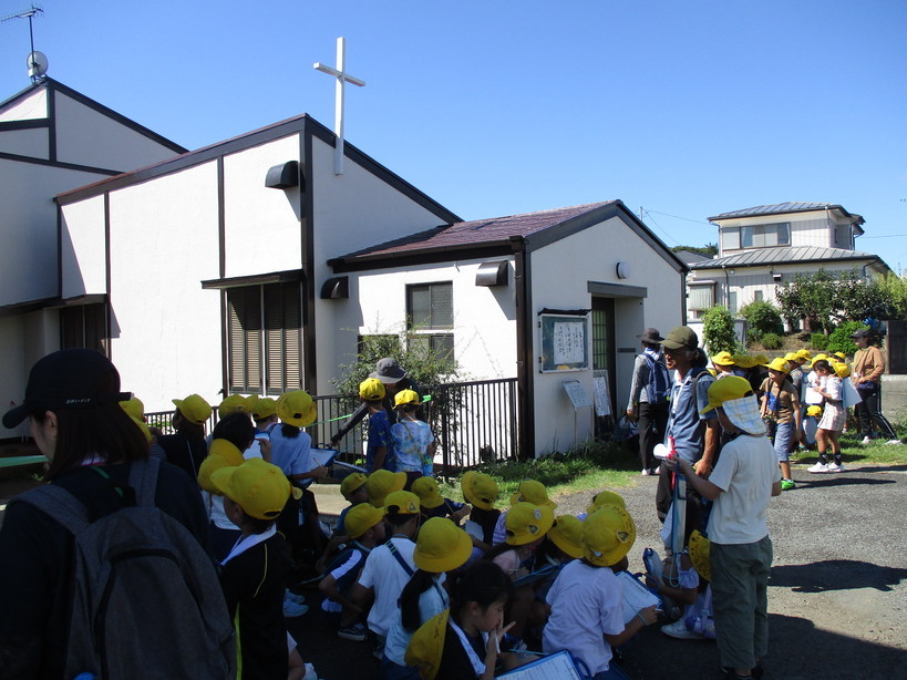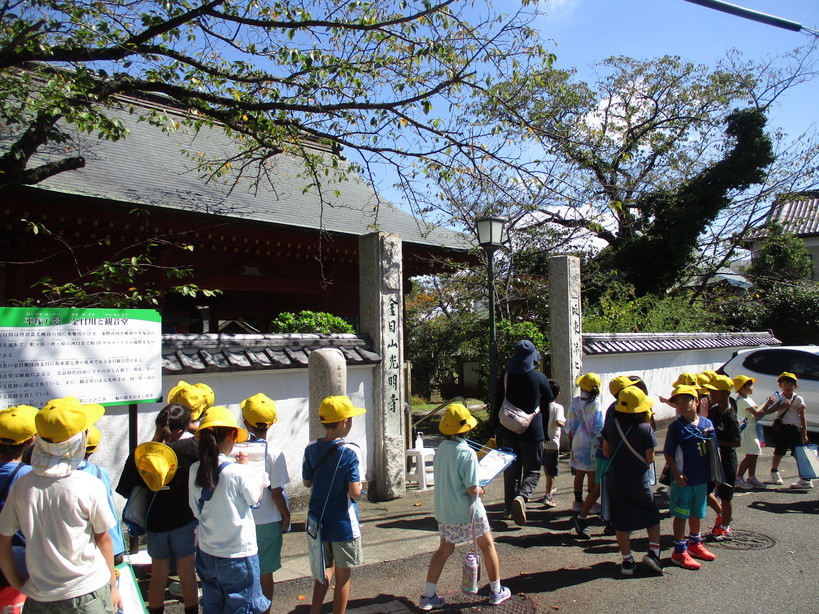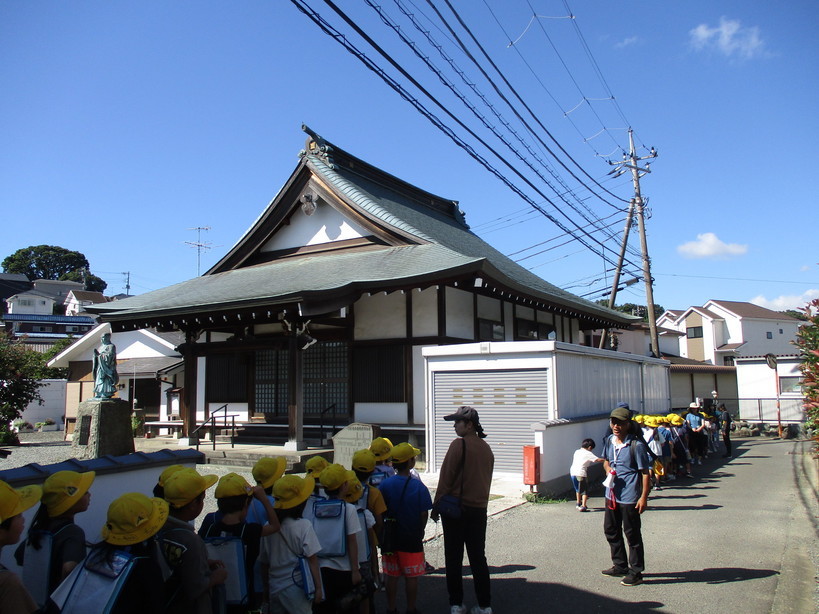朝から強い日差しが照り付ける中でしたが、2年生が生活科の学習で「はっけん金目たんけん」へ出かけました。 6月に続いて「金目エコミュージアム」の露木さんが講師として来てくださり、今日は学校の南側をぐるっと歩いてきました。 道中では、昔ながらの農家の造りや野菜貯蔵庫のこと、宗信寺は昔学校だったこと、金目教会は平塚で最初にできた教会であること等のお話をうかがうことができ、地域のことに興味を持つ良いきっかけになりました。 | ||